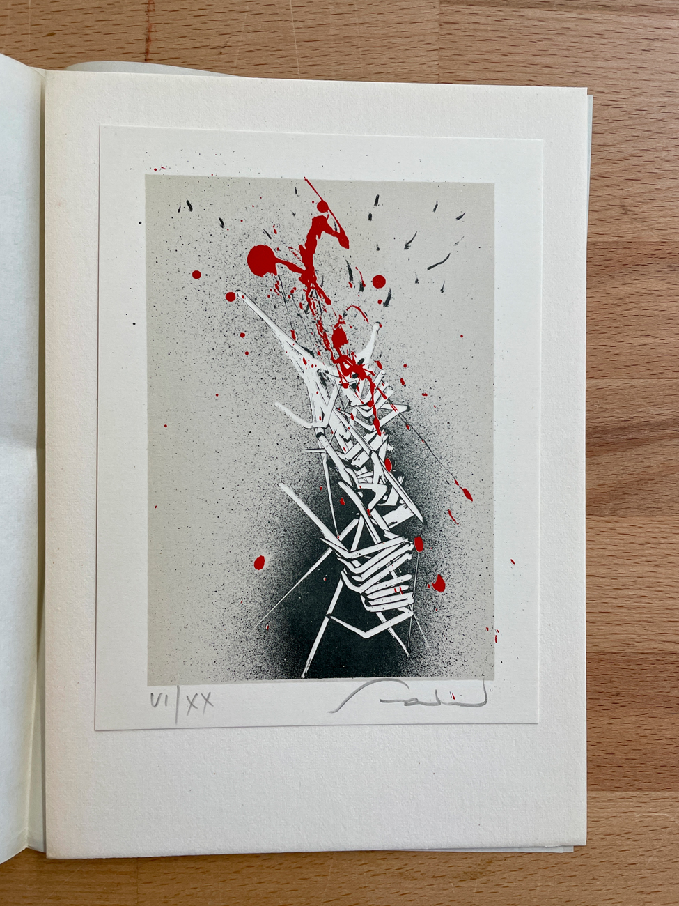 Piccolo cofanetto contenente una serigrafia di Emilio Scanavino recante firma e numerazione (Esemplare VI/XX) a matita al fronte e un testo di Roberto Sanesi