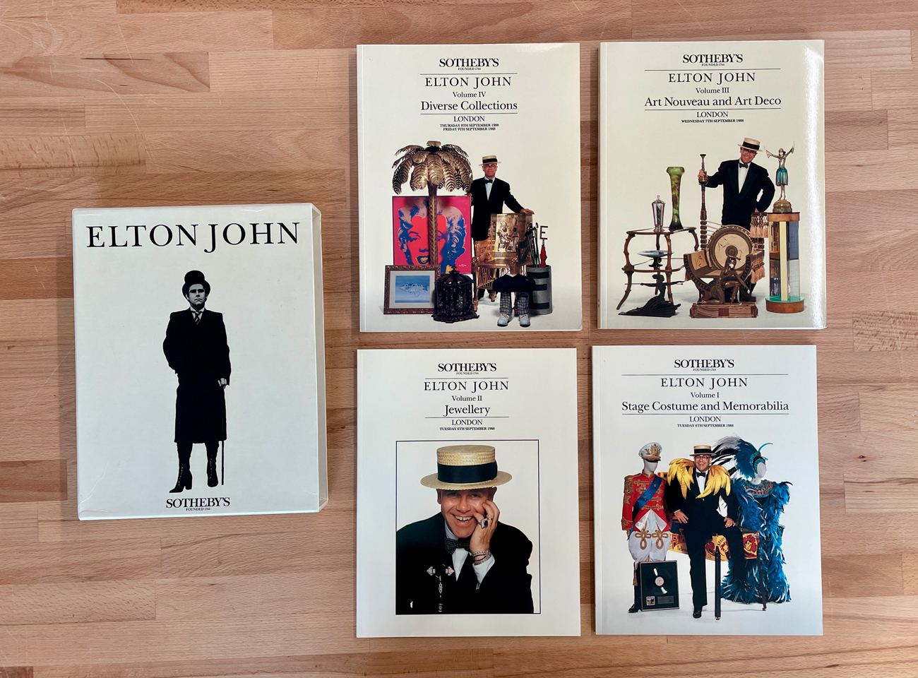 Cofanetto contenente 4 cataloghi di vendita prodotti da Sotheby's per l'asta della collezione di Elton John tenutasi nel 1988