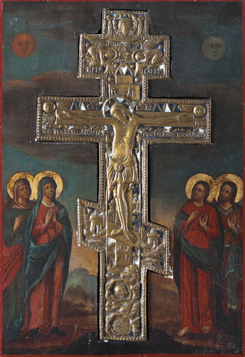 ICONA RUSSA DEL XIX SECOLO CrocefssioneTempera all'uovo su tavola con croce...