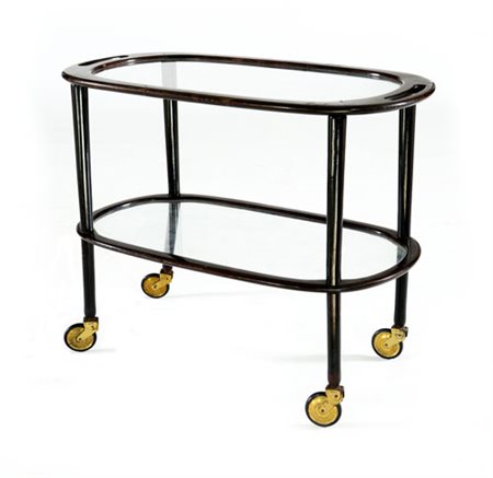 CARRELLO, ICO PARISI, ANNI '50, struttura in palissandro con sostegni e ruote metalliche, ripiani in vetro; difetti.