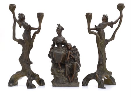 Metallo patinato, alt. cm 35, firma a rilievo; unito a COPPIA DI CANDELABRI LIBERTY IN METALLO PATINATO, INIZIO XX SECOLO, a due bracci con fusto a figura femminile, alt. cm 46.