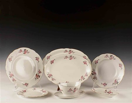 Servizio di piatti in porcellana decorata a motivo floreale composto da 8 piatti piani, 7 piatti fondi, 8 piattini, 4 piatti da portata e 2 salsiere.