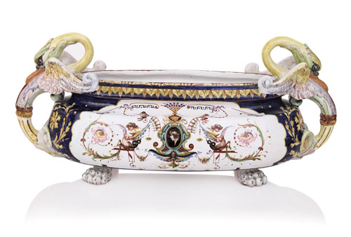 FIORIERA IN CERAMICA, MELANDRI E FOCACCIA, FAENZA, 1925 CA., ovale con anse a cigno e piedi ferini, decoro policromo a grottesche su fondo blu; marchio "M" simbolo Astorre "F" e "Faenza MF".