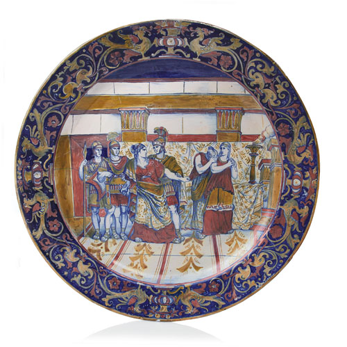 GRANDE PIATTO IN CERAMICA DECORATA A LUSTRO, GUALDO TADINO, A.SANTARELLI, INIZIO XX SECOLO, decoro con scene storiche romane e tese a vasi e volute zoomorfe; marca "AS" raggiera