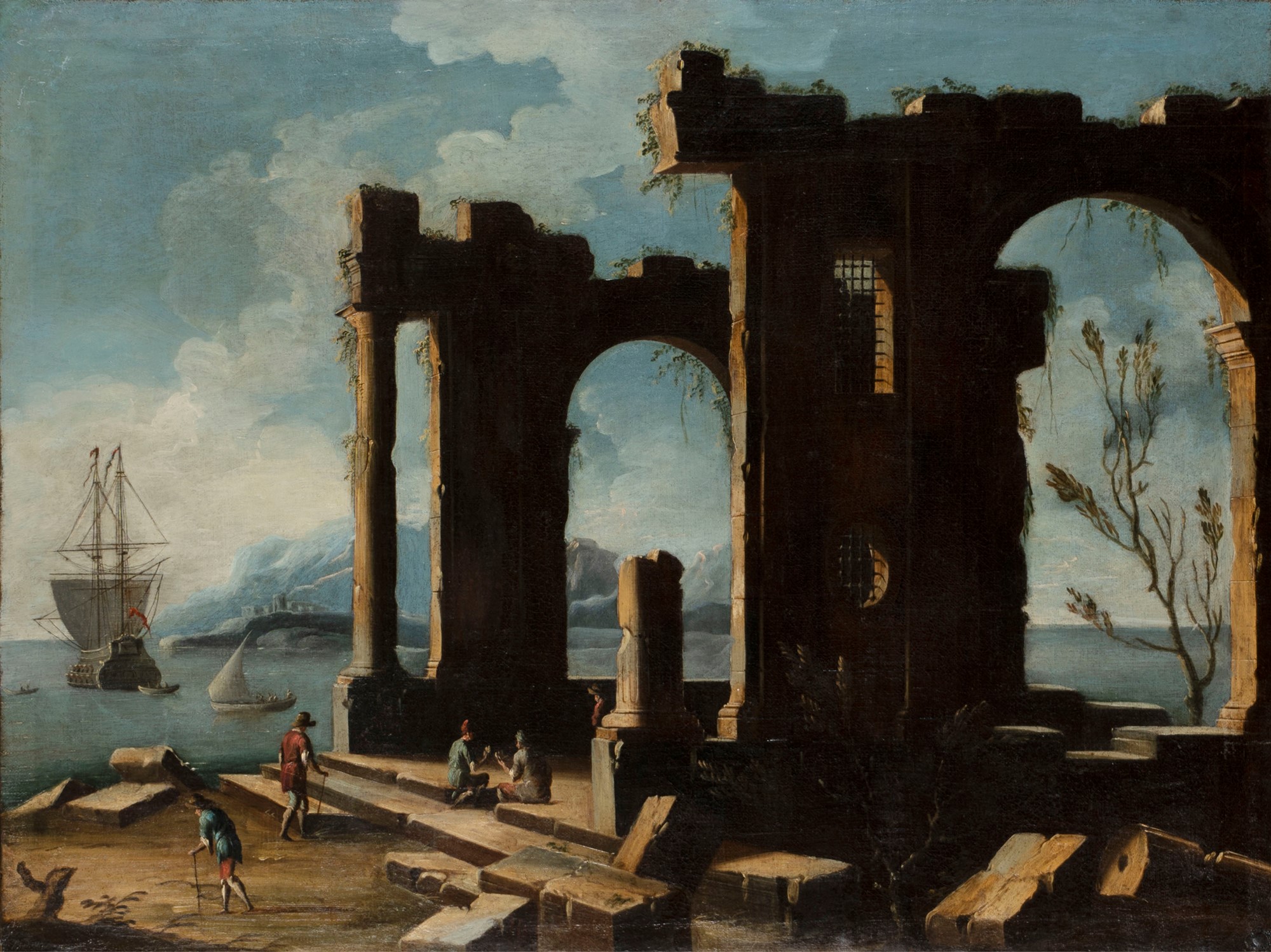 Scuola napoletana, secolo XVIII - Paesaggio costiero con rovine e figure