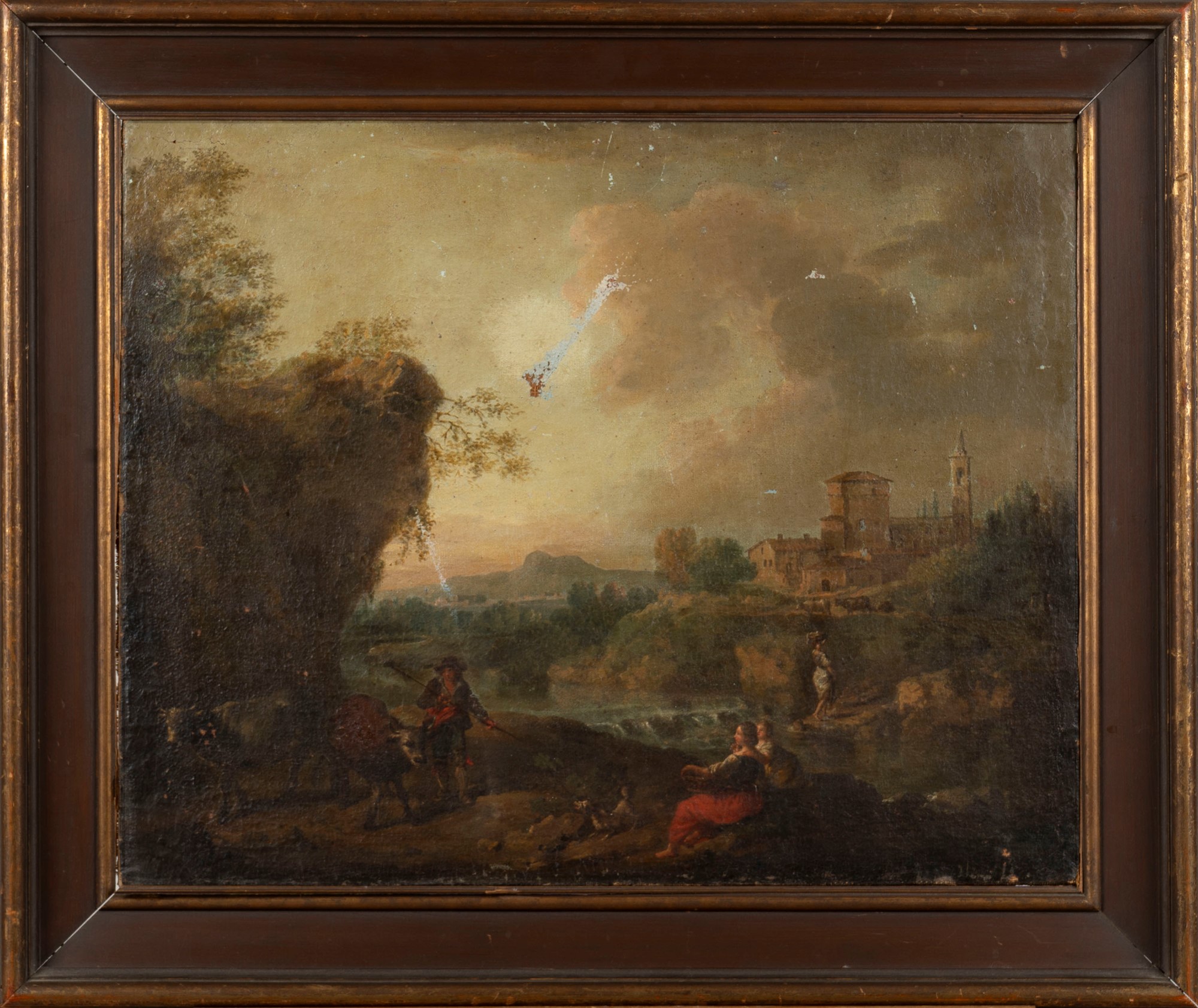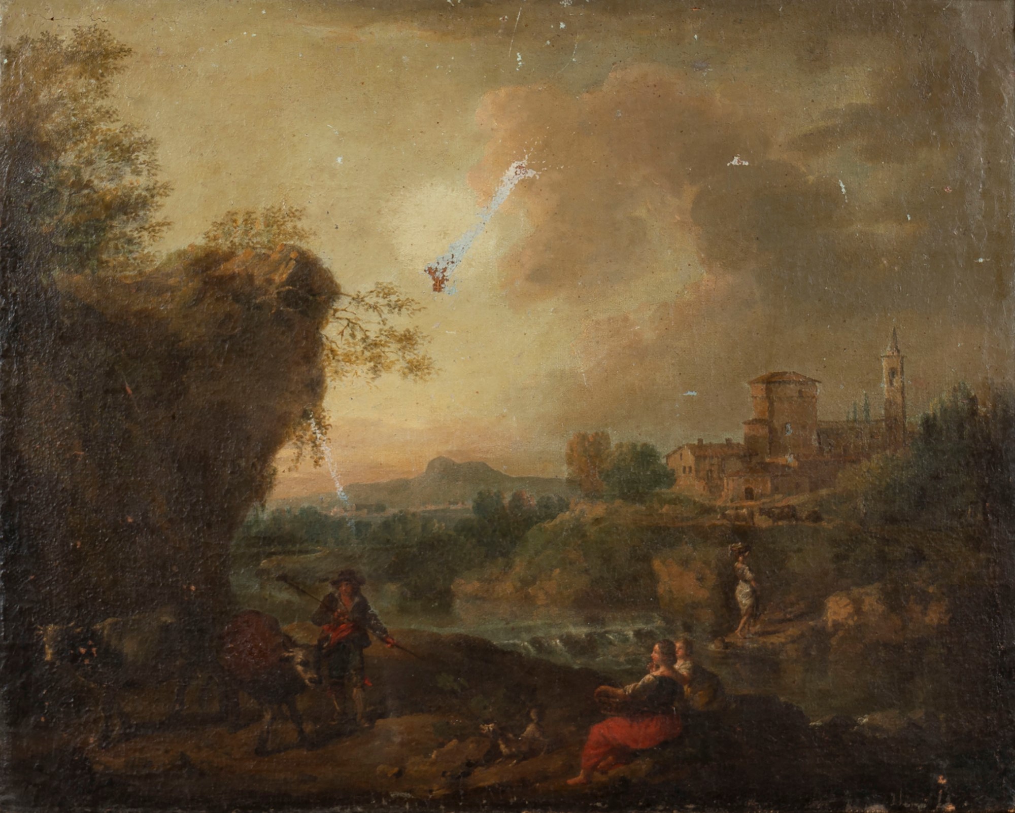 Scuola veneta, inizi secolo XVIII - Paesaggio fluviale con pastore e lavandaie