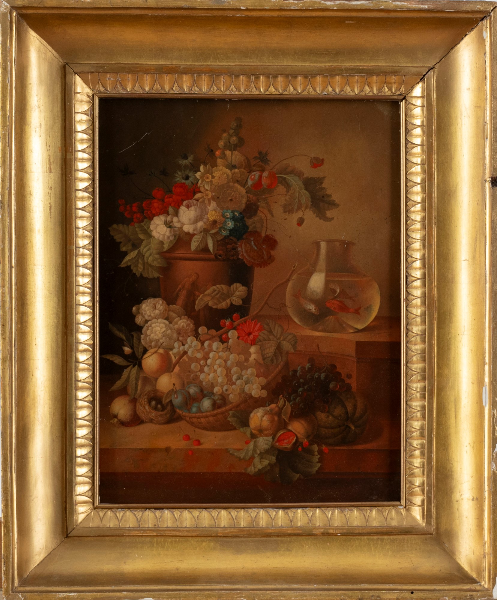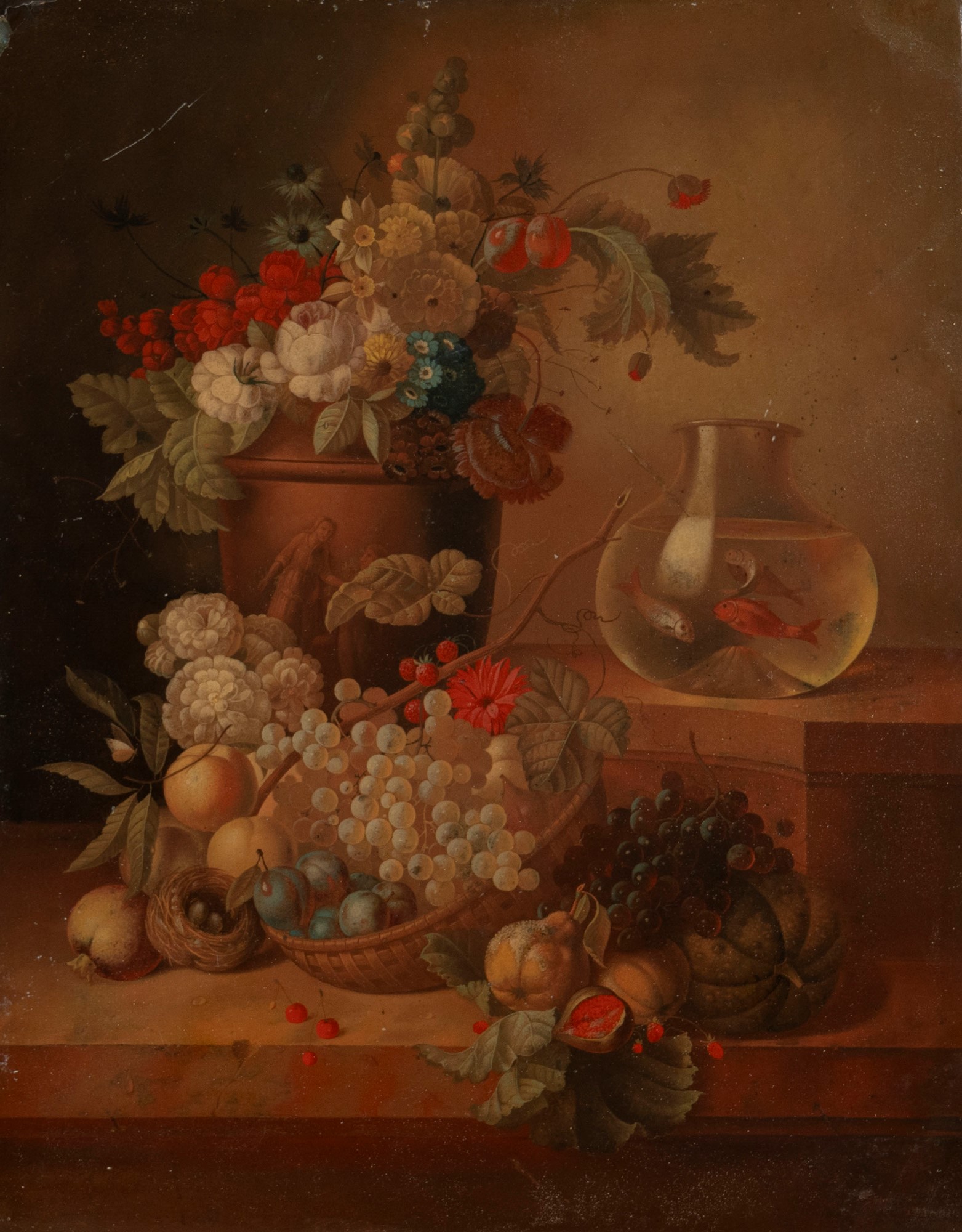 Lot 32 | Scuola italiana, nei modi di Abraham Brueghel - Frutta, fiori in un vaso e pesci rossi