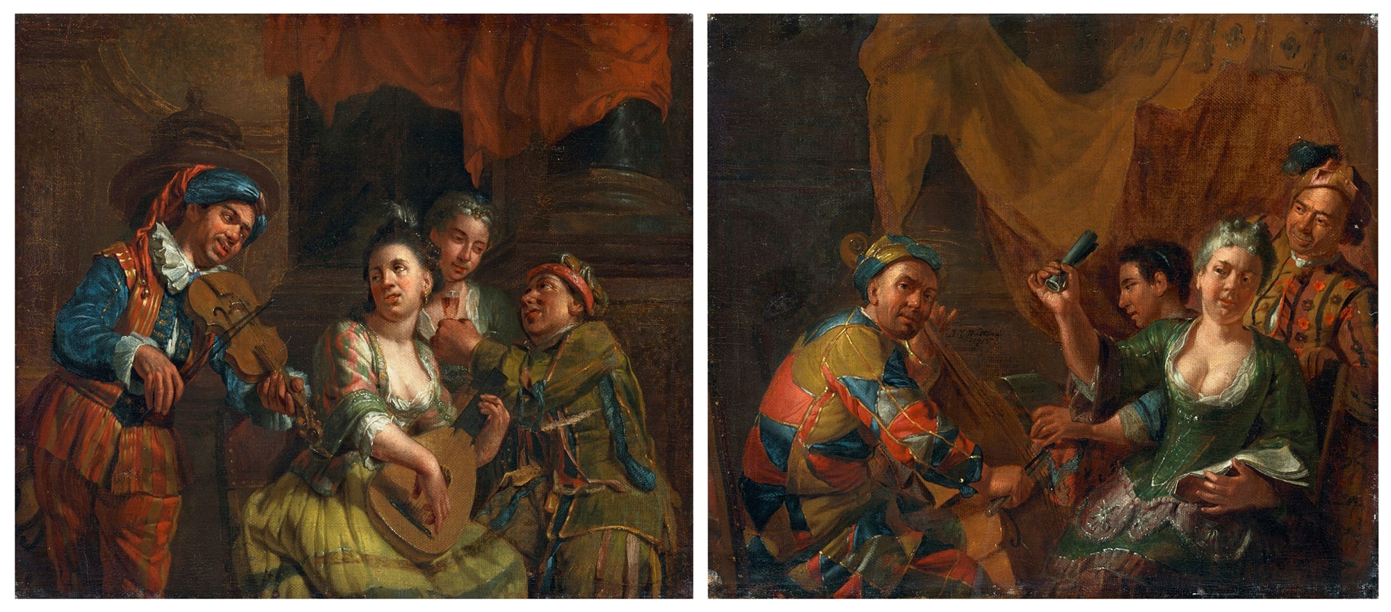 Scuola dell'Italia meridionale, secolo XVIII - Concertino in un interno; e Arlecchino suonatore
