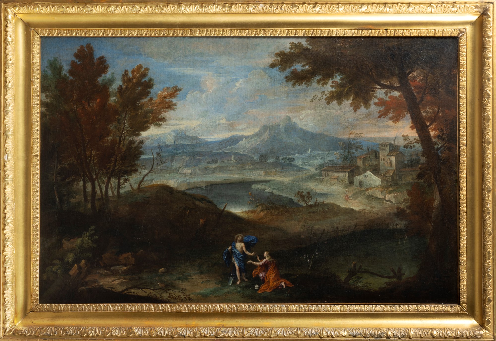 Scuola emiliana, secolo XVII - Paesaggio fluviale con Noli me tangere