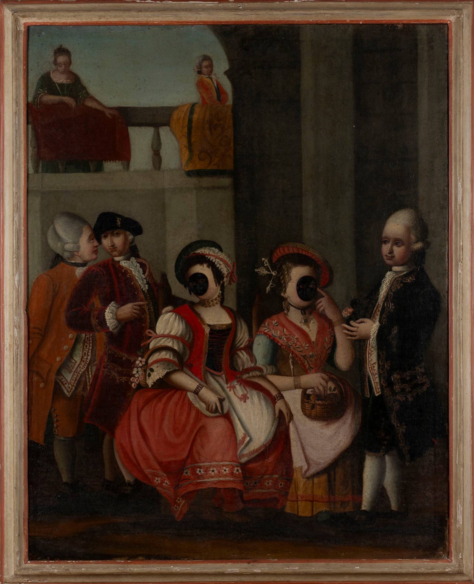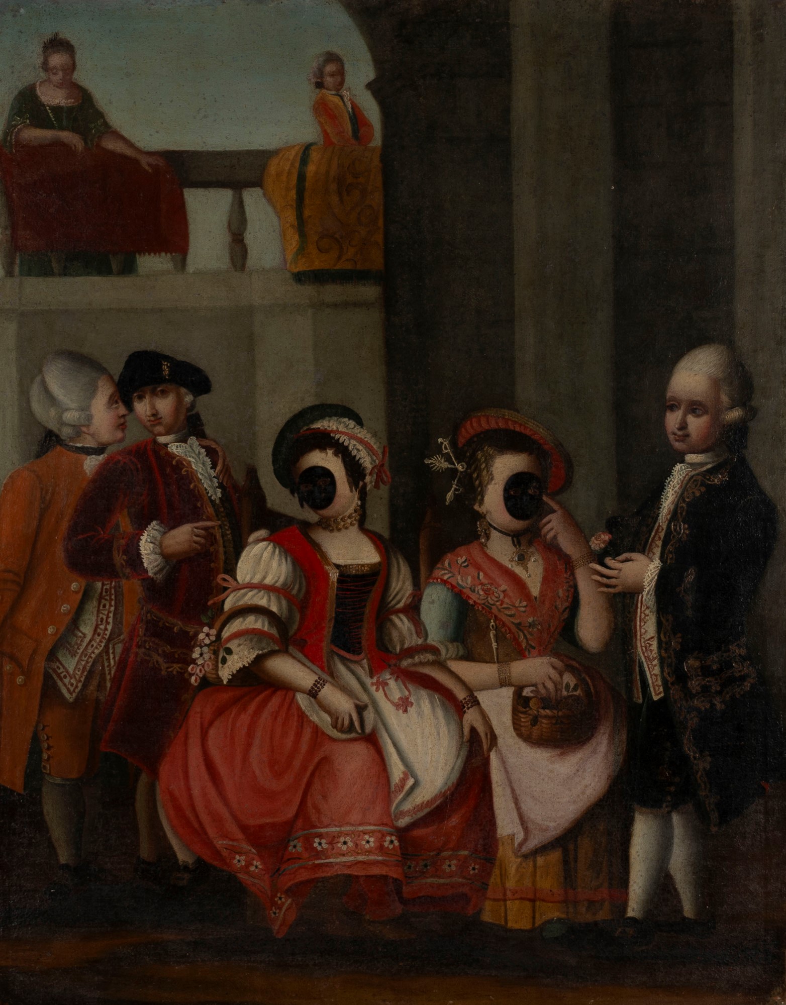 Scuola veneta, secolo XVIII - Scena di interno con personaggi in maschera