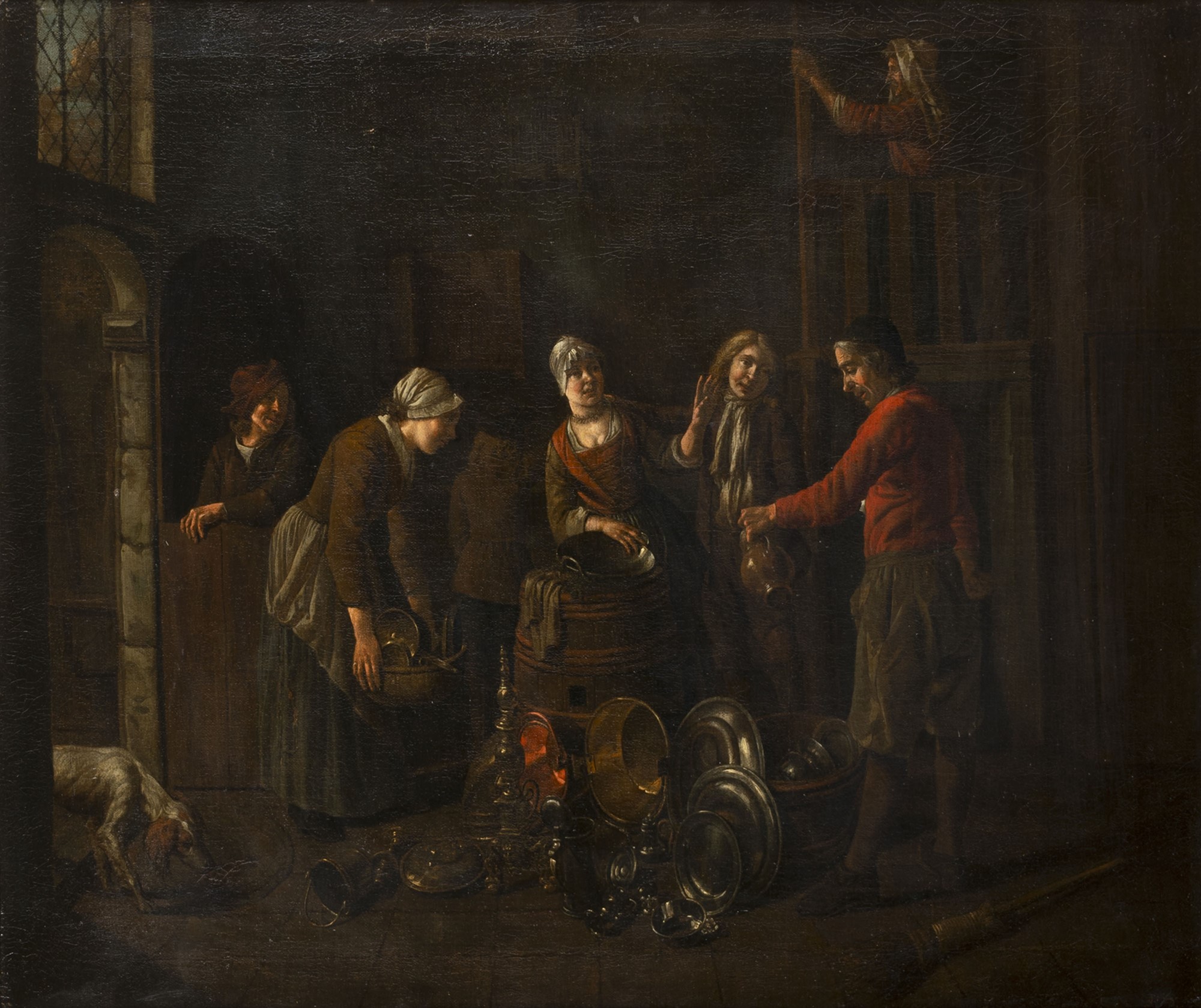 Scuola fiamminga, secolo XVII - Scena d'interno con venditore di vasellame