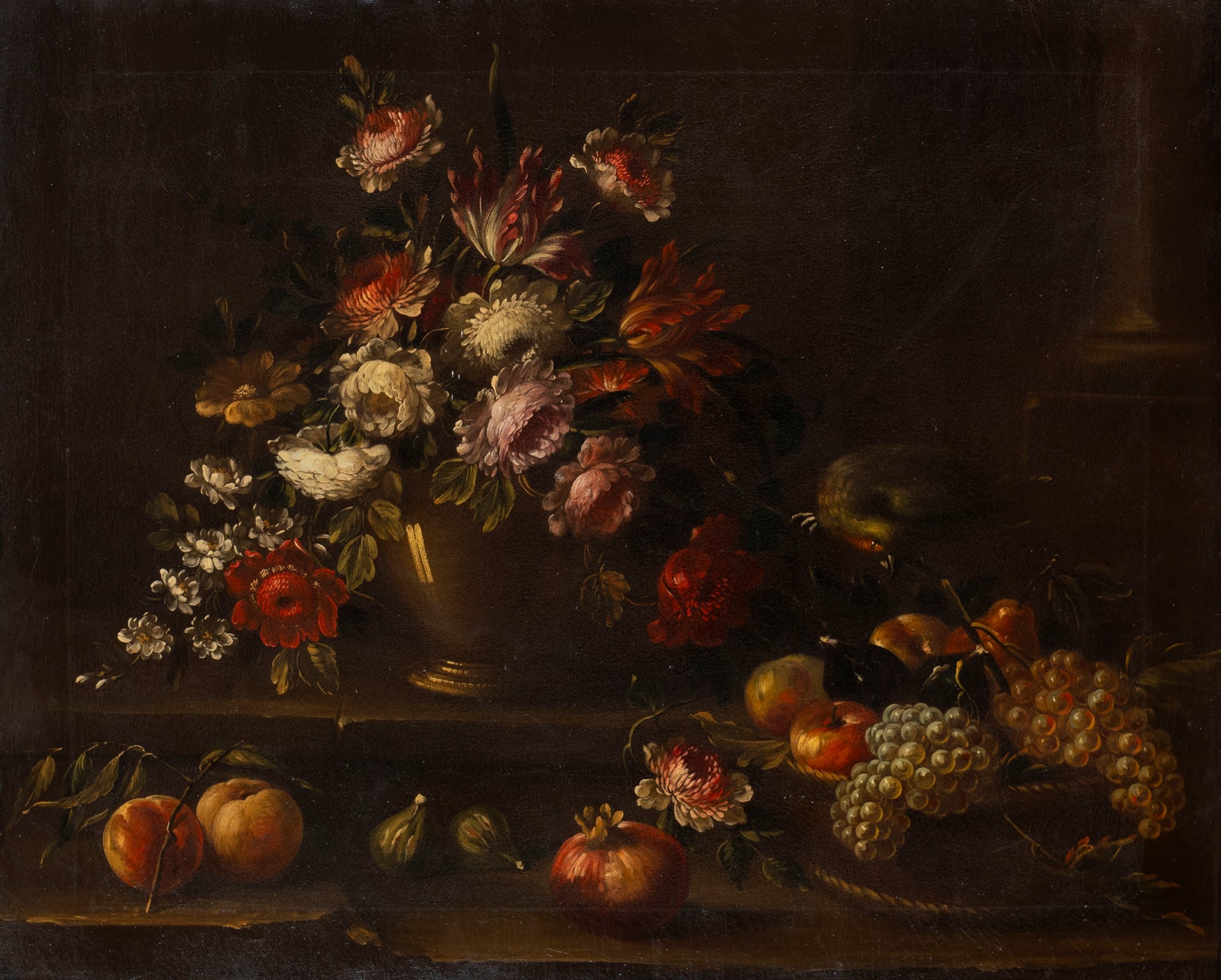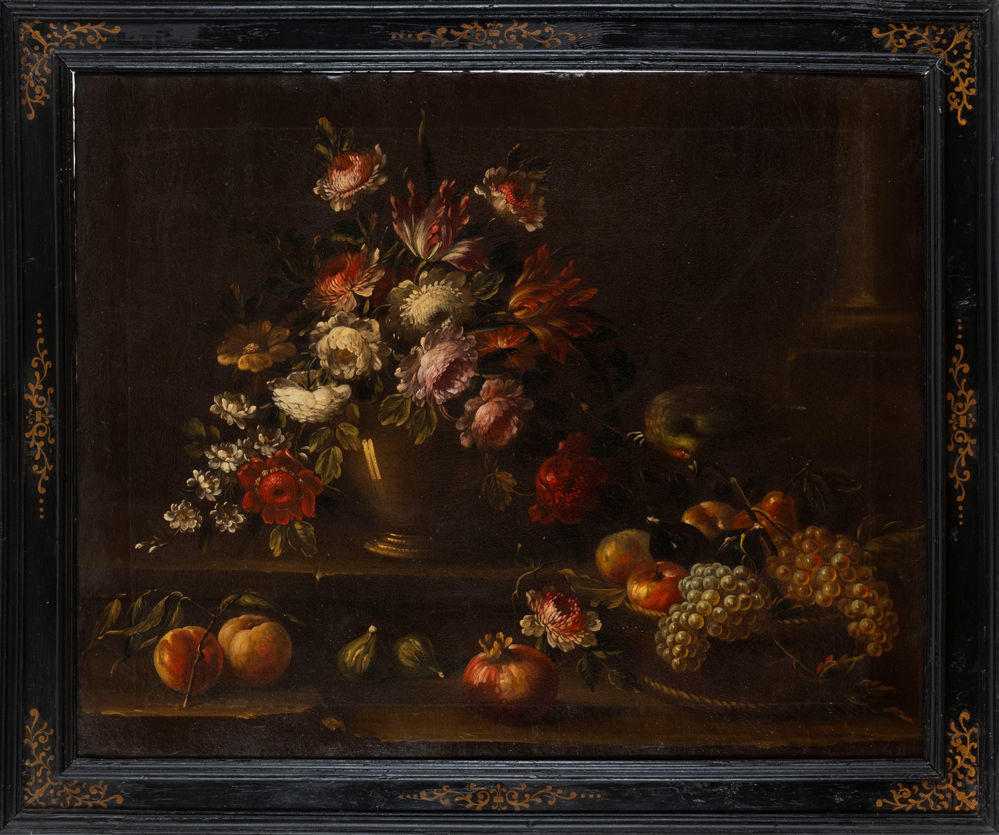 Scuola italiana, secolo XVIII - Rose, tulipani e altri fiori in un vaso, frutta su un piano con pappagallo