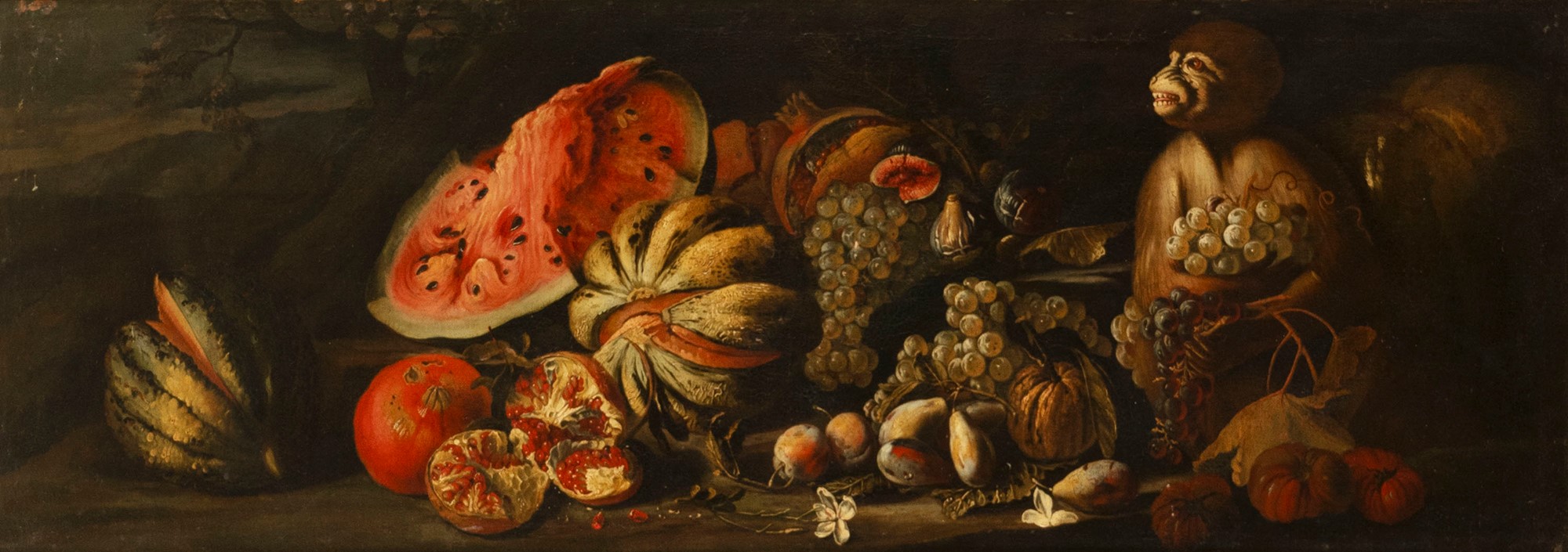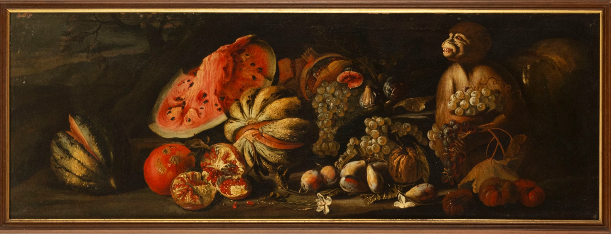 Scuola napoletana, secolo XVII - Anguria, melone, melograno e altri frutti con scimmietta en plein air