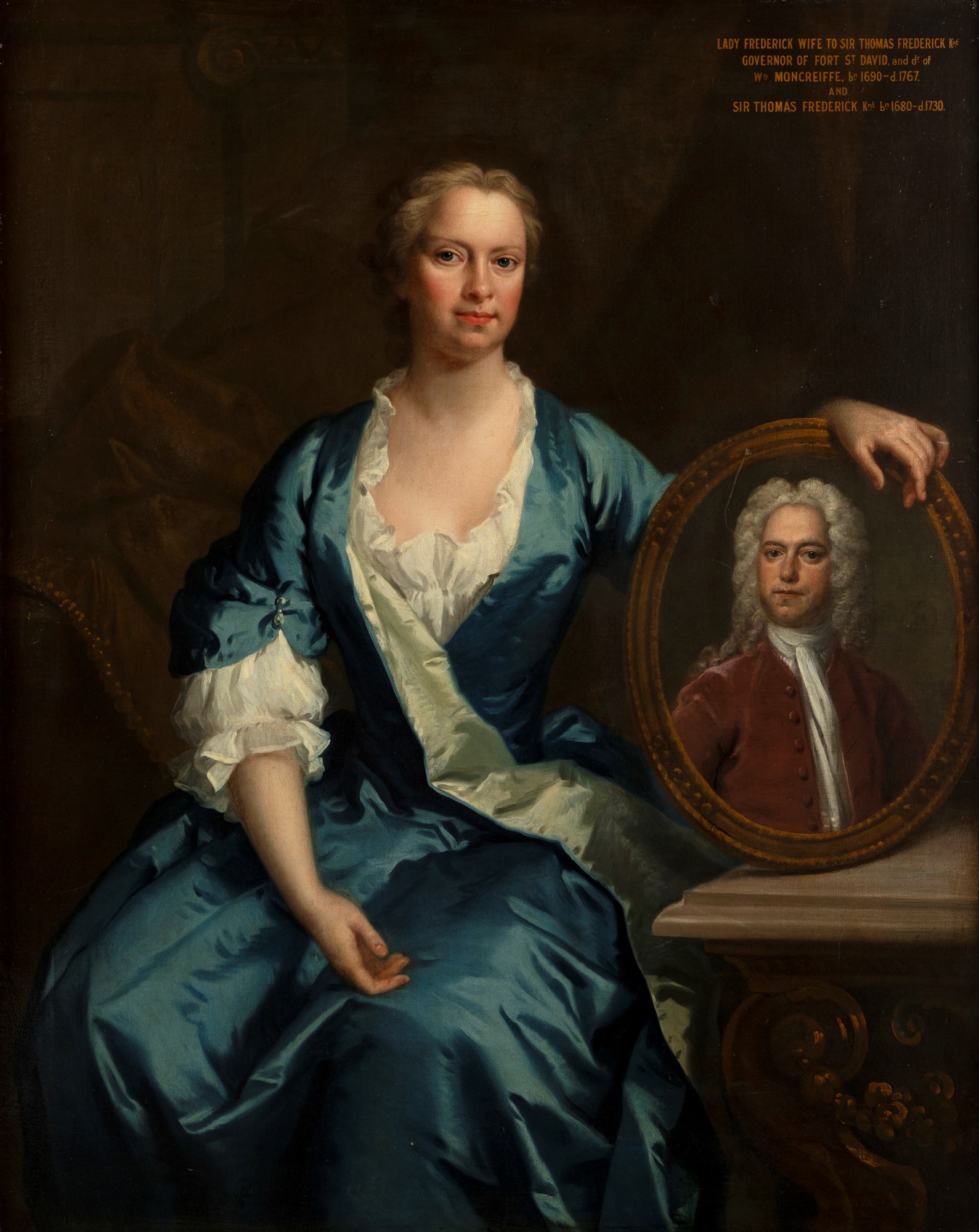 iscritto in alto a destra: LADY FREDERICK WIFE TO SIR THOMAS FREDERICK K.nt / GOVERNOR OF FORT ST DAVID, and dr of / Wth MONCREIFFE, b.n 1690 - d.1767. / AND SIR THOMAS FREDERICK K.nt B.n 1680 - d. 1730.