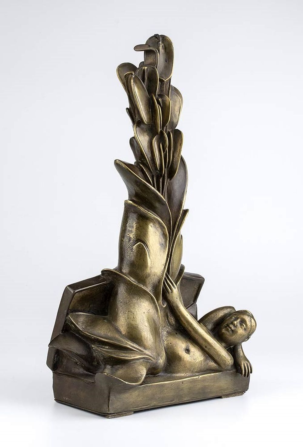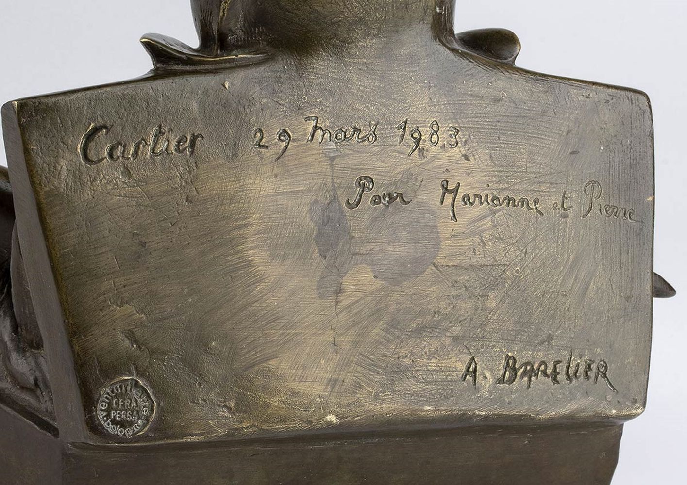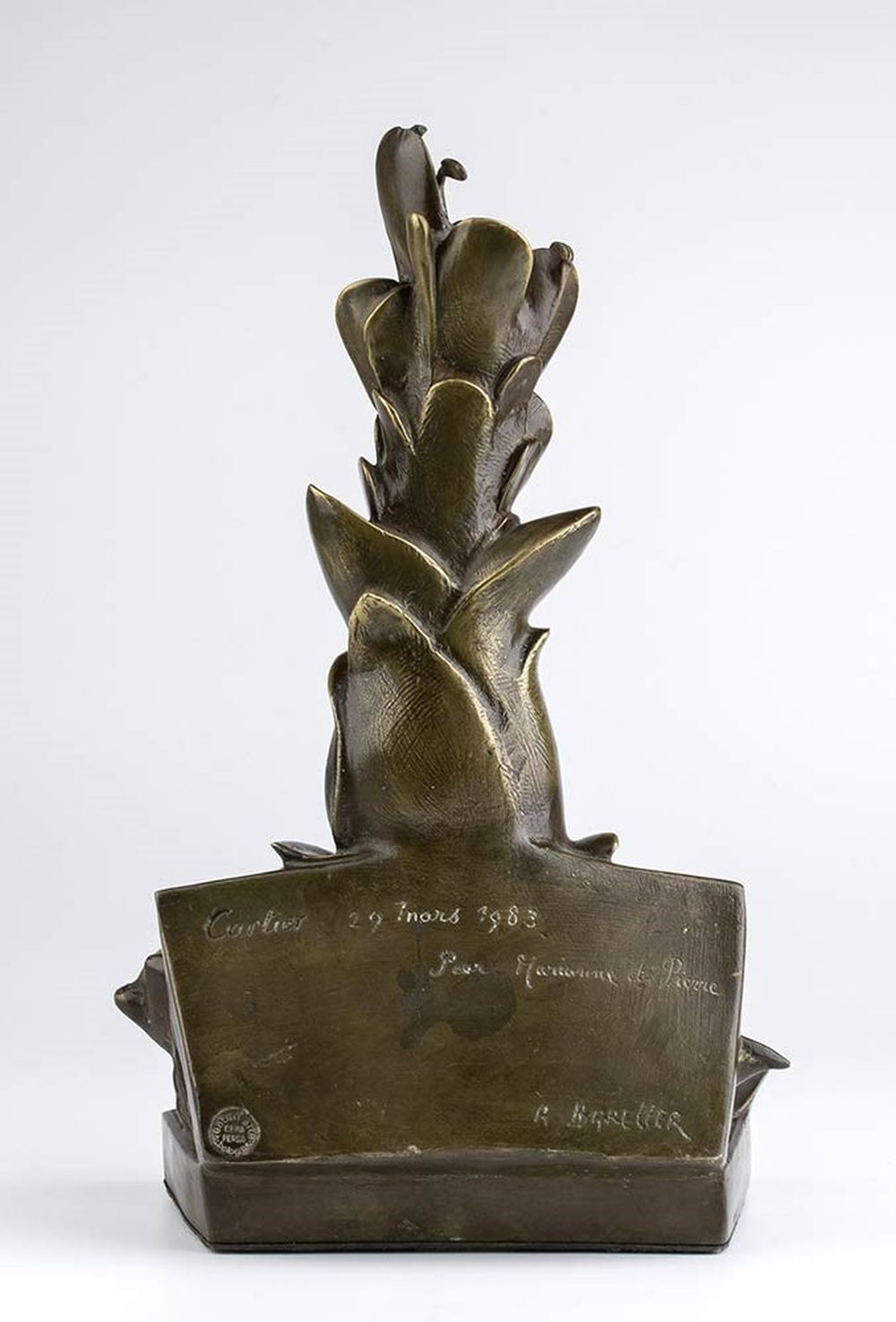 Andre Barelier, 1934-2021, ha studiato all'Accademia d'Arte di Marsiglia e all'Ecole des Beaux Arts di Parigi. Questa scultura in bronzo è la rappresentazione di un premio Cartier del 1985: da uno scrigno emerge una divinità femminile da cui si dipartono foglie, fiori e frutti.Sul retro in alto "Cartier 29 mars 1983, pour marianne et pierre". Firmata in basso a destra "A. Barelier"; sulla sinistra il marchio della fonderia.