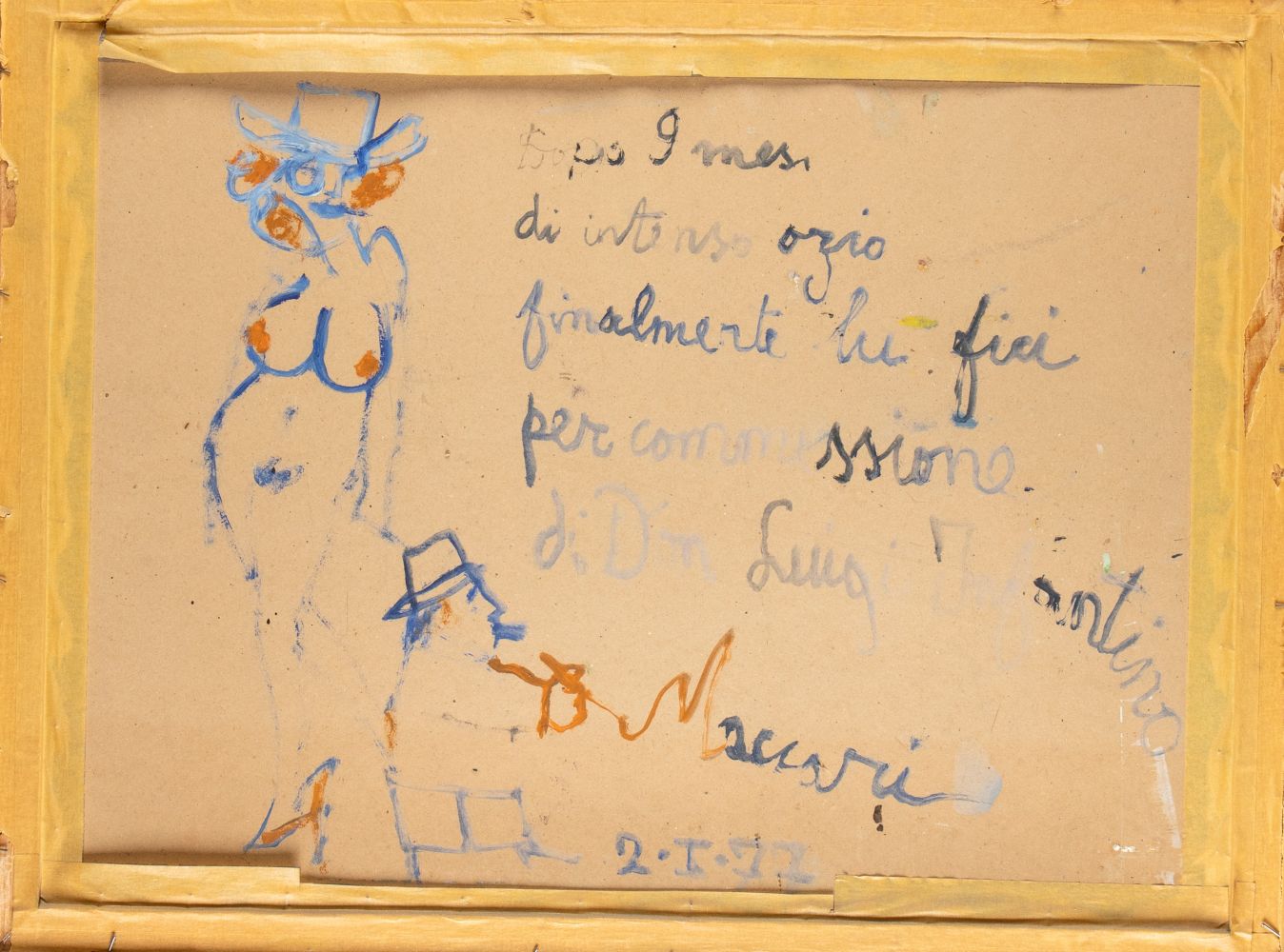 Firmato in basso a destra: Maccari, al retro figure, dedica, firma e data: "Dopo 9 mesi di intenso ozio finalmente lu fici per commissione di Don Luigi Infantino", Maccari, 2 I '77