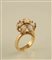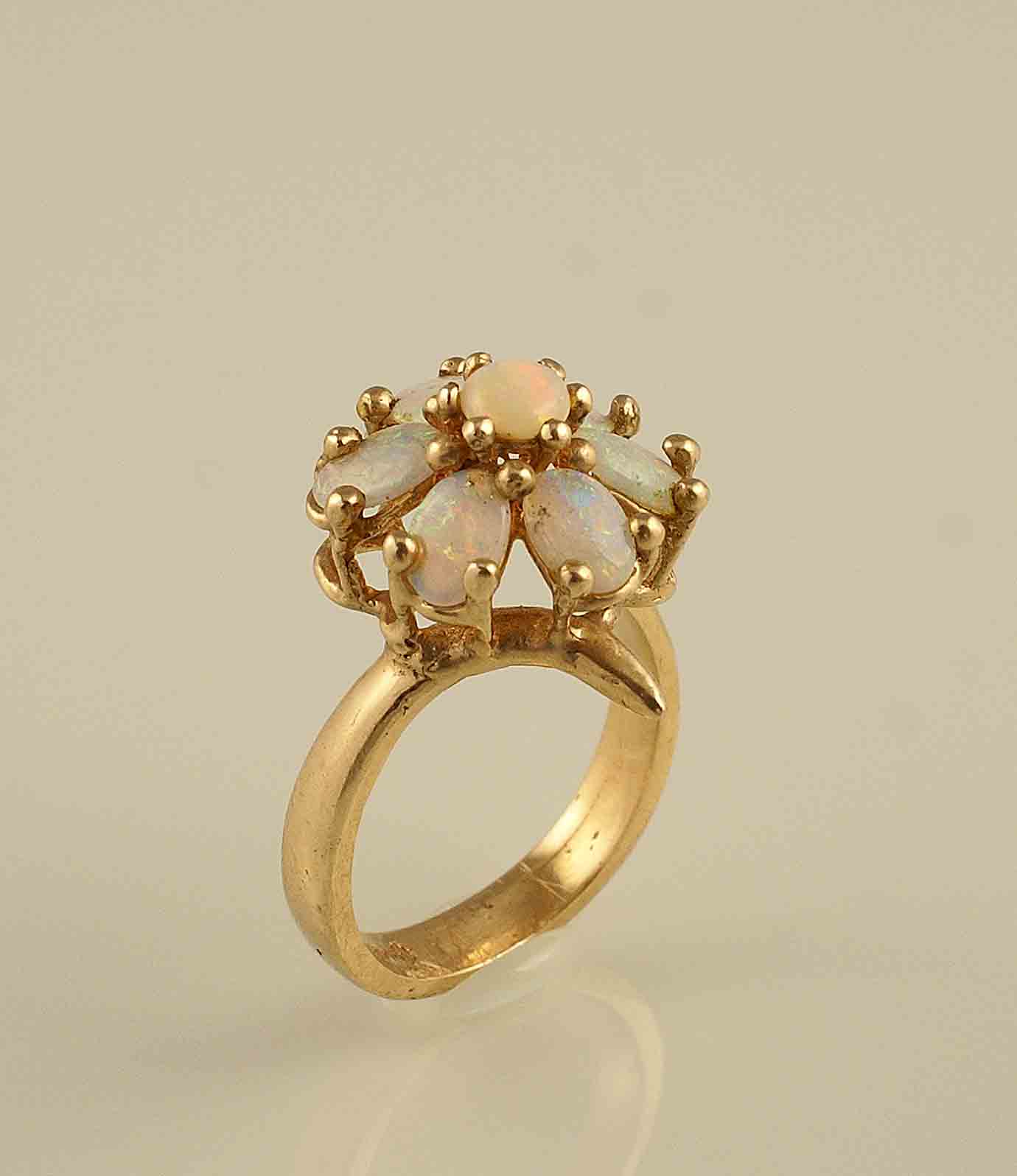 Anello in oro giallo 14kt con incastonati opali arlecchino, anni 50/60, gr. 6,4.