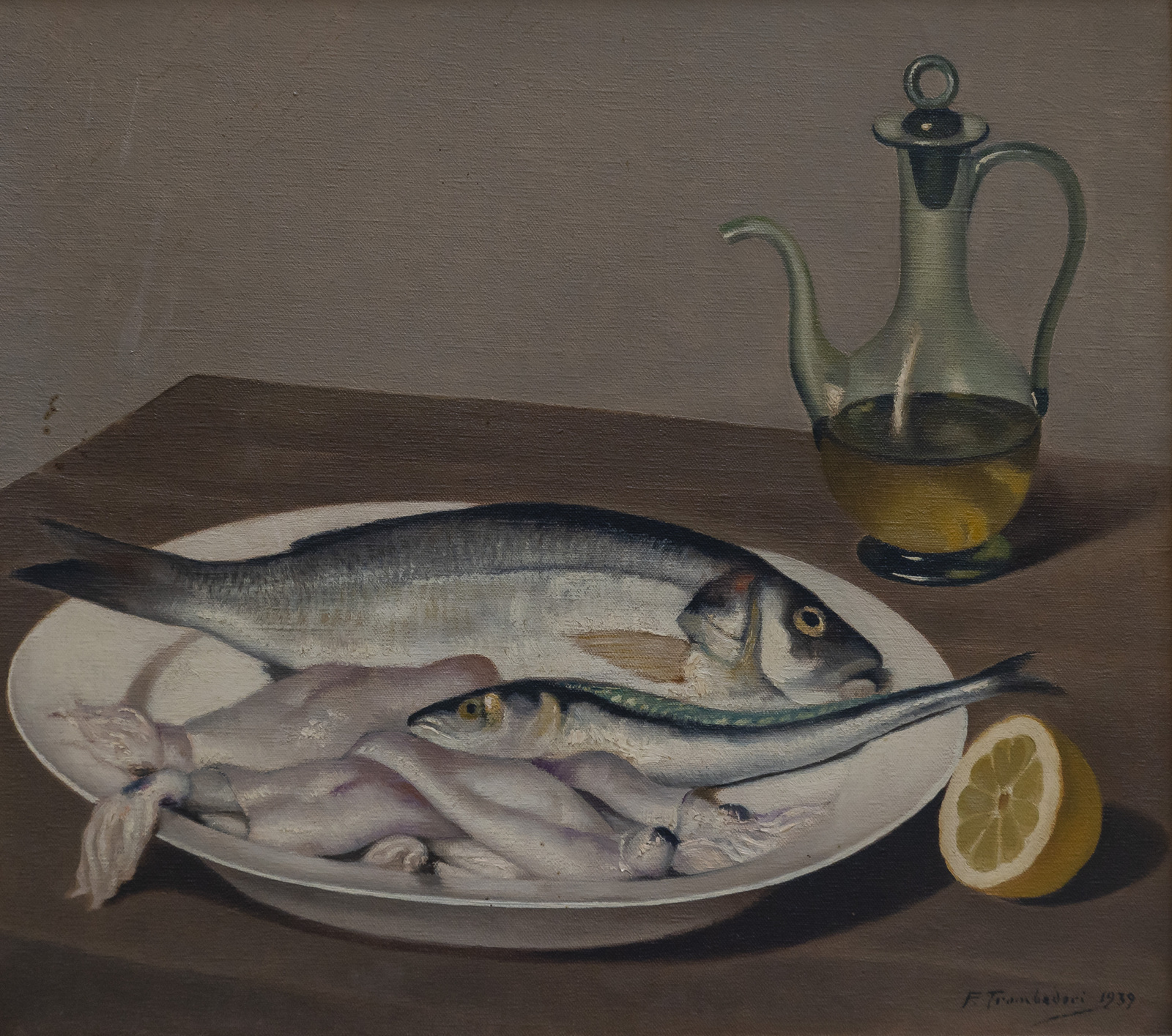 TROMBADORI FRANCESCO (1886 - 1961) Natura morta con pesci. 1939. Olio su tela . Cm 41,00 x 38,00. Firma e anno in basso a destra. Autentica di Donatella Trombadori su fotografia, Museo Francesco Trombadori, Roma. Provenienza: Collezione privata, Roma. Cornice presente