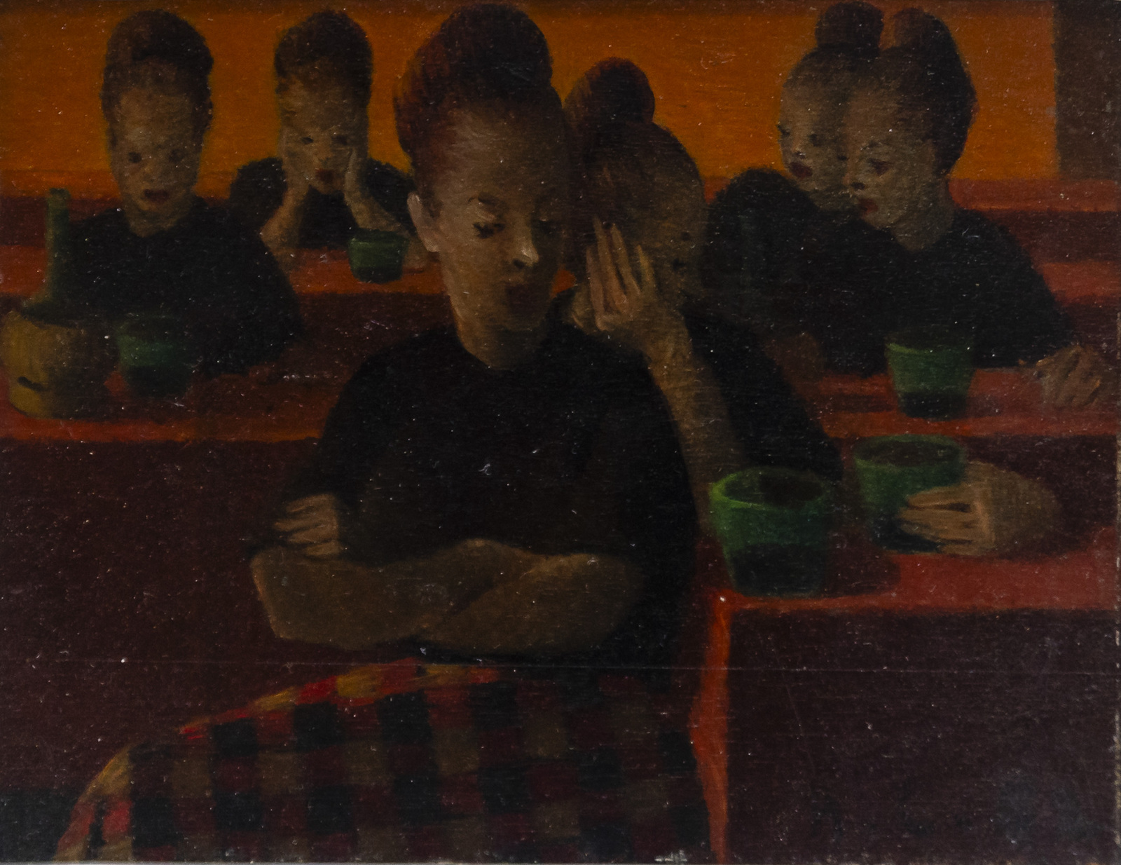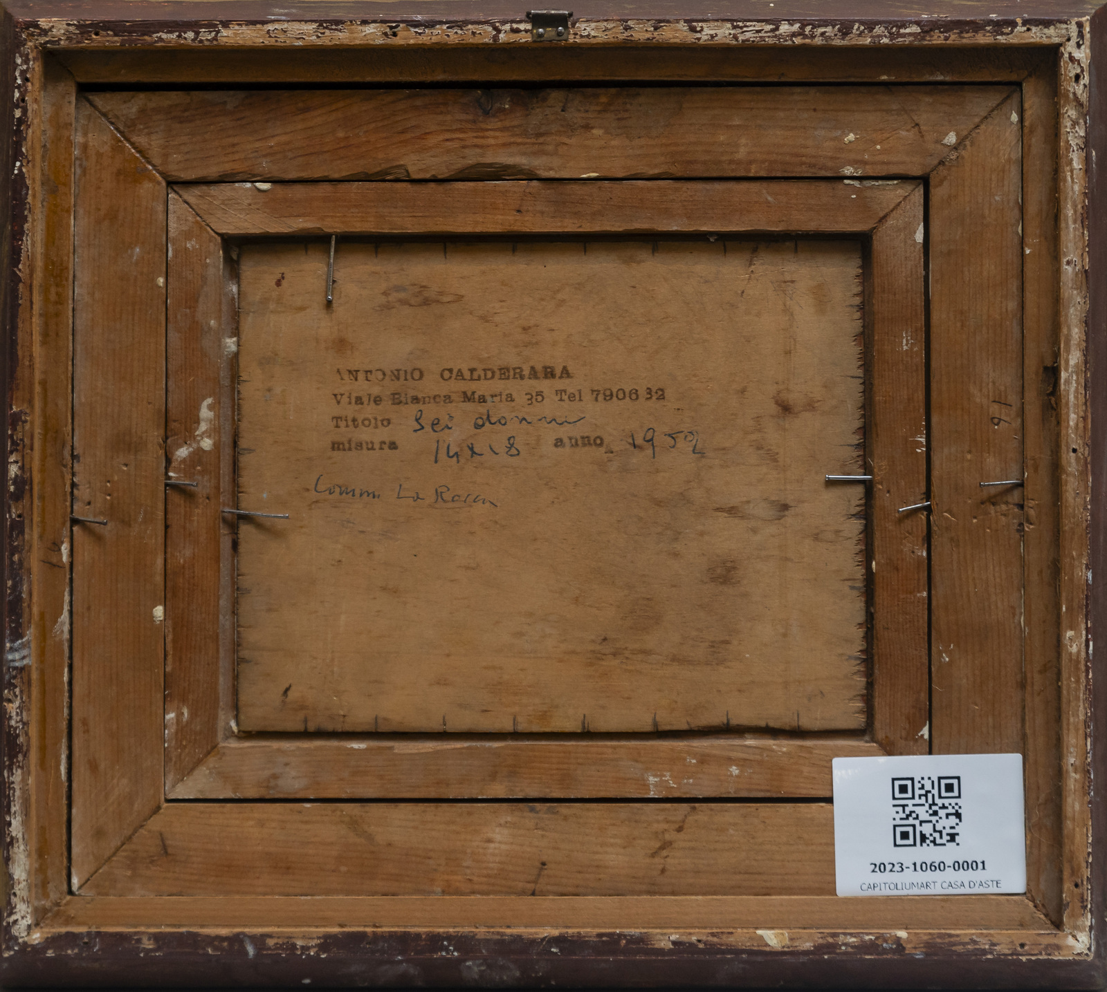 CALDERARA ANTONIO (1903 - 1978) Sei donne. 1952. Olio su tavola. Cm 18,00 x 14,00. Al retro timbro dell'artista con titolo e anno. Opera archiviata presso la Fondazione Antonio Calderara, Milano, come da documentazione fotografica allegata all'opera riportante il relativo numero d'inventario. Lievi difetti.