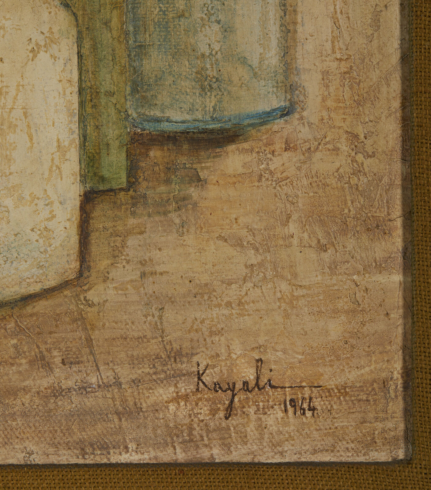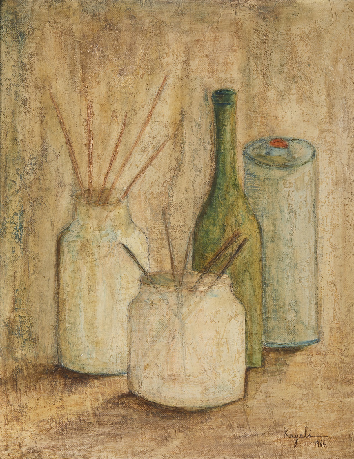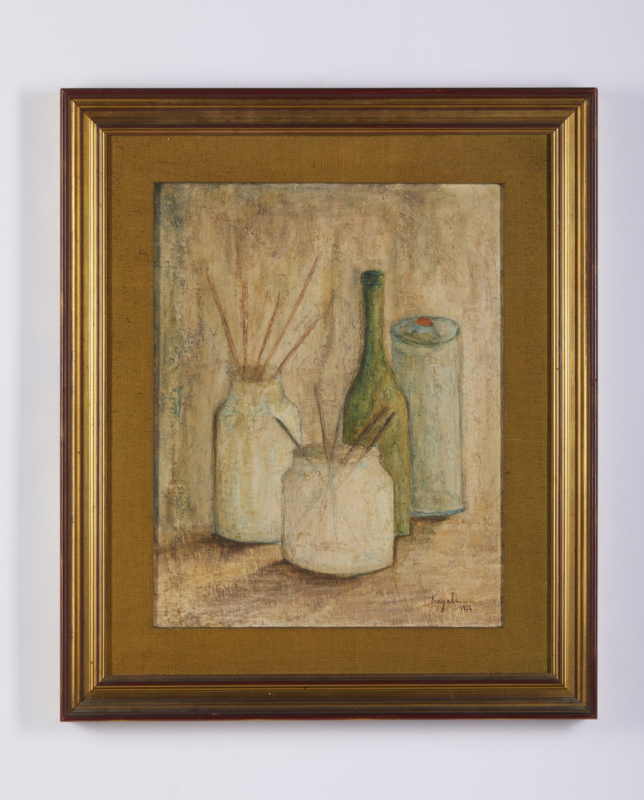 KAYALI LOUAY (1934 - 1978) Natura morta. 1964. Olio su tela . Cm 38,00 x 49,50. Firma e anno in basso a destra. Provenienza: Collezione privata, Roma. Difetti. Cornice presente