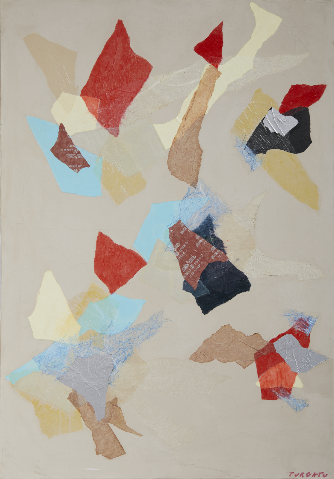 TURCATO GIULIO (1912 - 1995) Senza titolo. 1970. Olio e collage su tela. Cm 70,00 x 100,00. Firma in basso a destra e al retro. Opera archiviata presso l'Archivio Giulio Turcato, Roma, come da documentazione fotografica allegata all'opera riportante il relativo numero d'inventario. Provenienza: Collezione privata, Pavia.