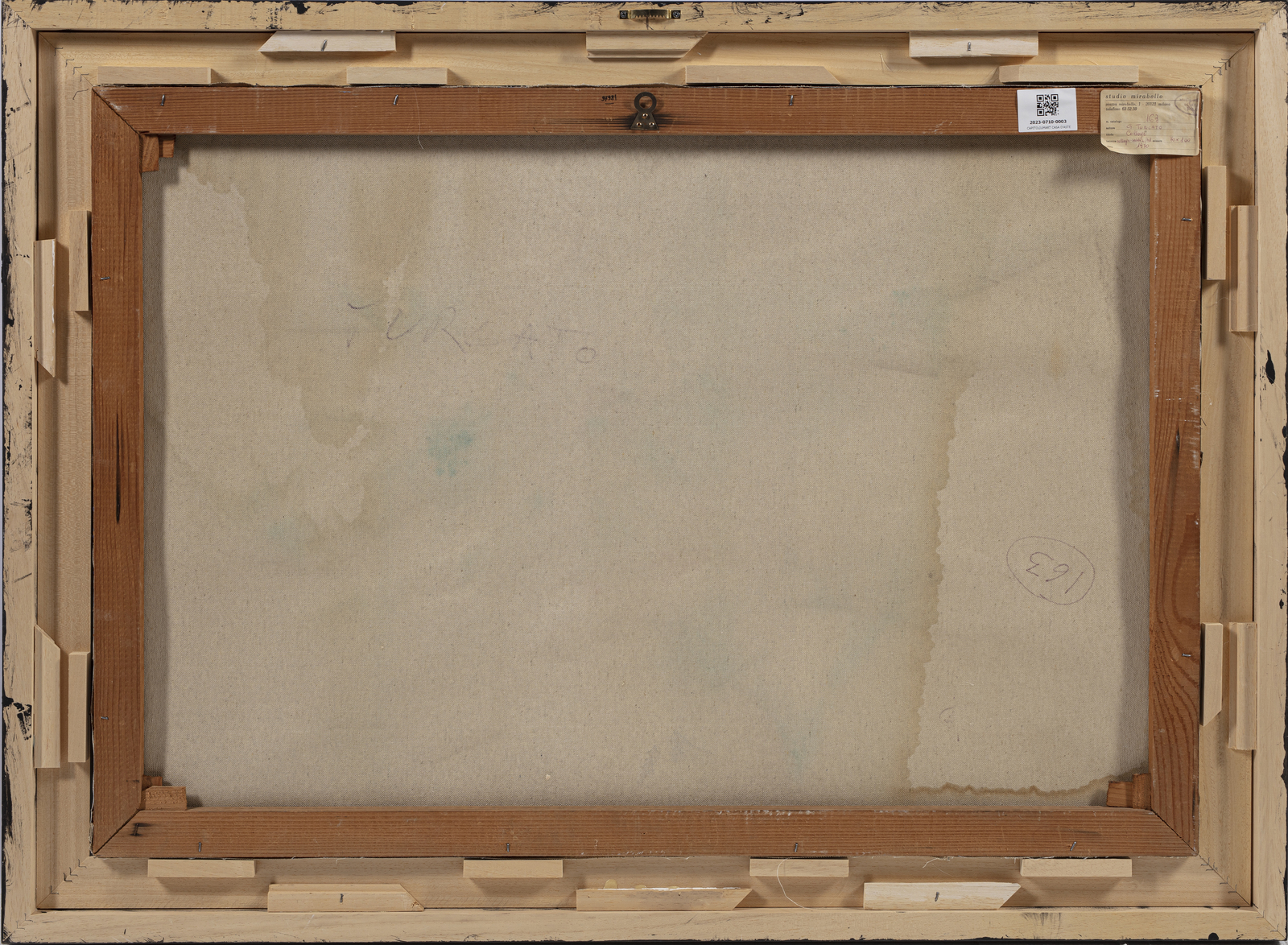 TURCATO GIULIO (1912 - 1995) Collage. 1970. Tecnica mista e collage su tela. Cm 100,00 x 70,50. Al retro firma ed etichetta Studio Mirabello, Milano. Opera archiviata presso l'Archivio Giulio Turcato. Provenienza: Studio Mirabello, Milano; Collezione privata, Firenze. Lievi difetti. . Cornice presente