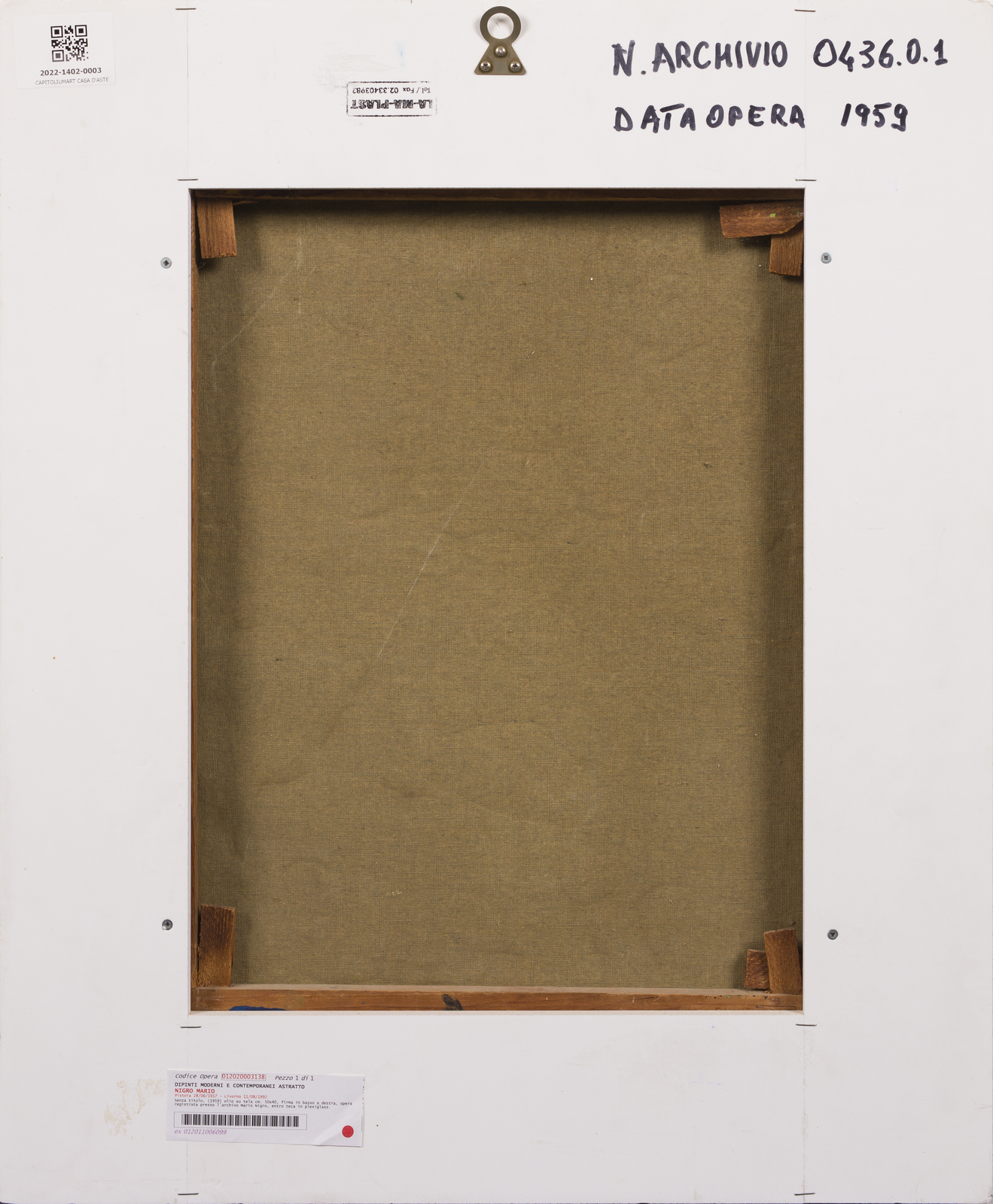 NIGRO MARIO (1917 - 1992) Senza titolo. 1959. Olio su tela . Cm 40,00 x 50,00. Firma in basso a destra, Opera archiviata presso l'Archivio Mario Nigro, Milano. Entro teca di plexiglass. Lievi difetti. Cornice presente
