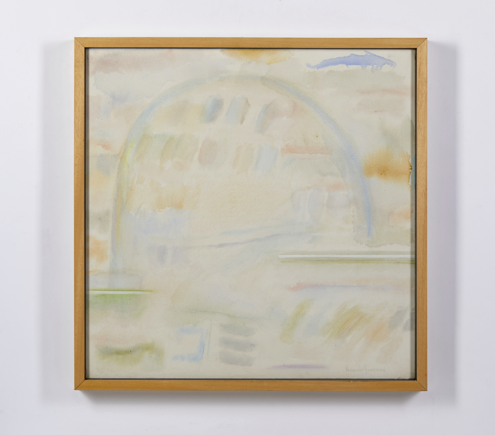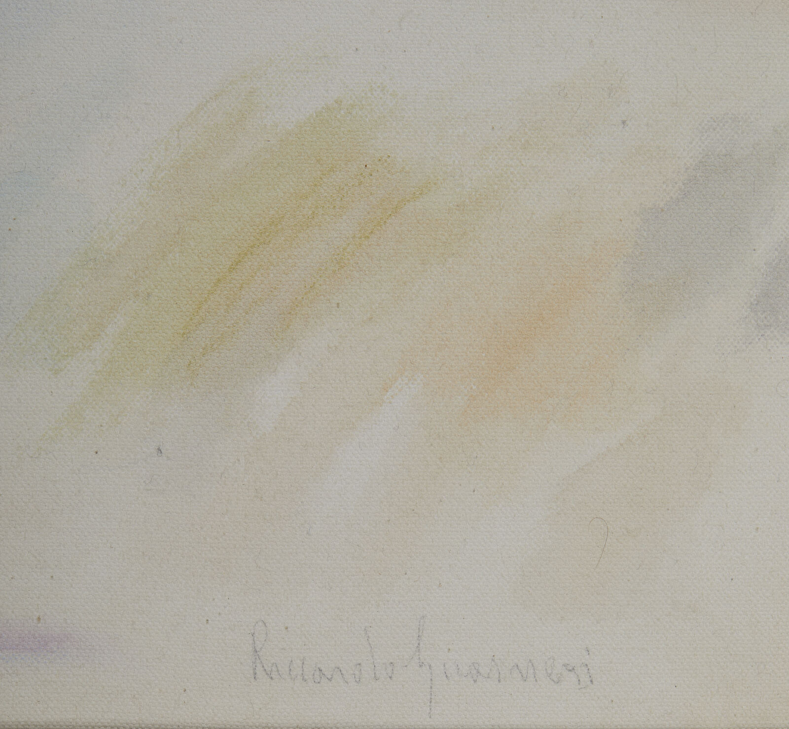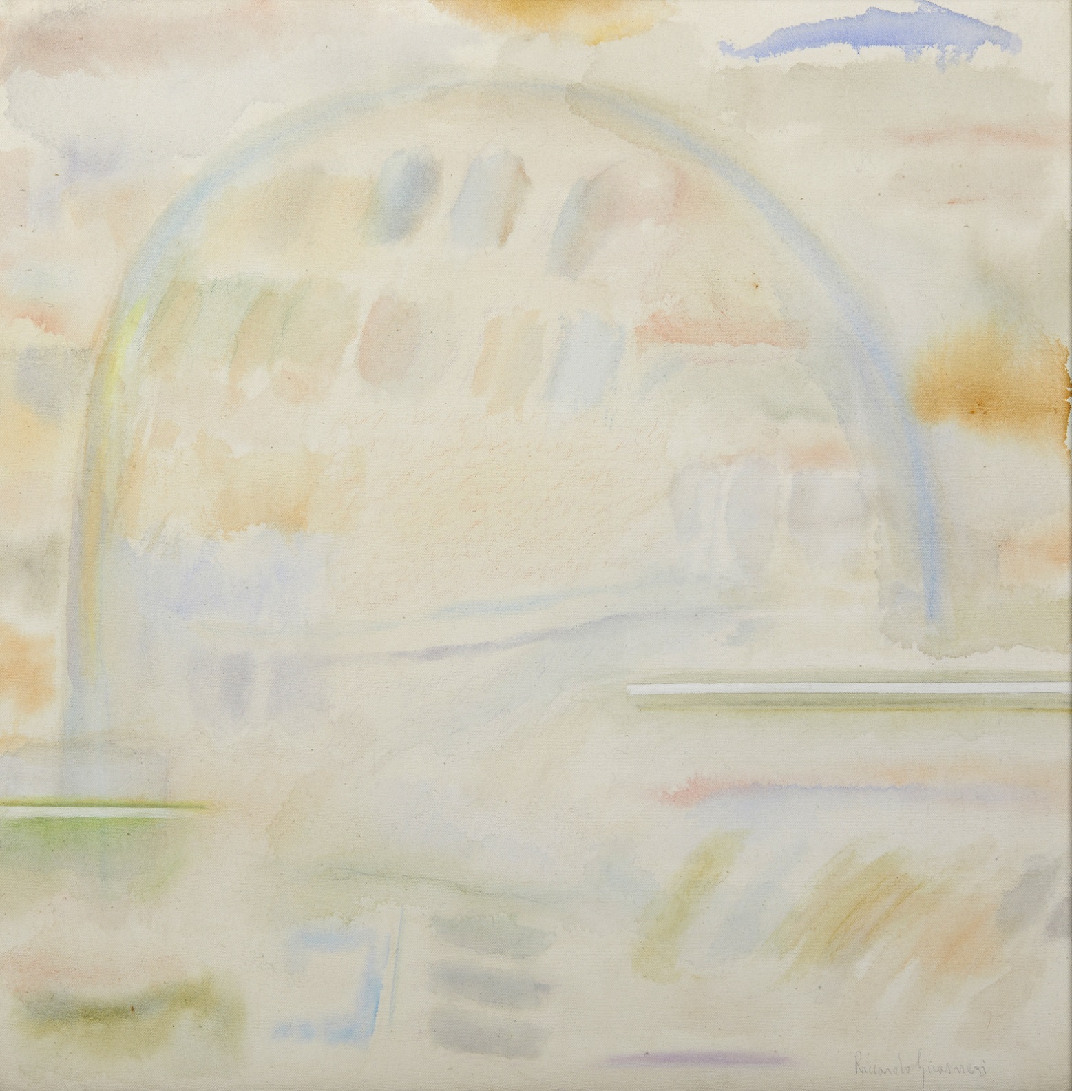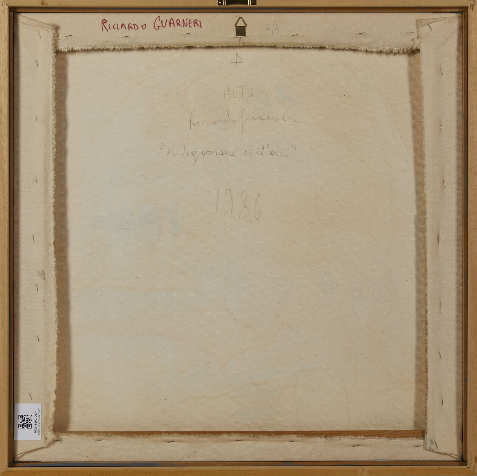 GUARNERI RICCARDO (n. 1933) Divulgazione nell'arco. 1986. Olio su tela . Cm 64,00 x 64,00. Firma in basso a destra. Al retro titolo, firma e anno. Autentica dell'artista su fotografia.