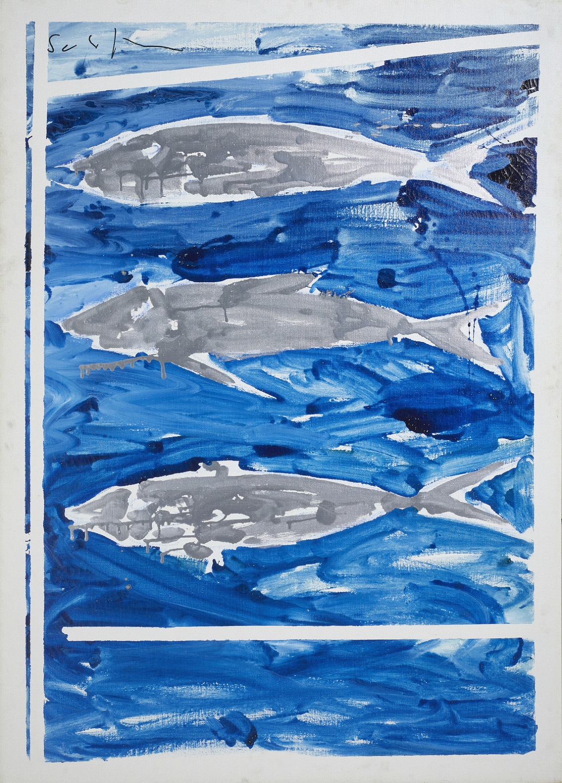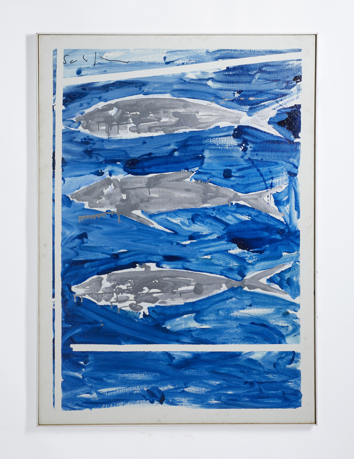 SCHIFANO MARIO (1934 - 1998) Pesci. 1979. Smalto su tela. Cm 140,00 x 100,00. Firma in alto a sinistra e al retro. Opera in corso di archiviazione presso l'Archivio Mario Schifano - Monica Schifano, Roma.