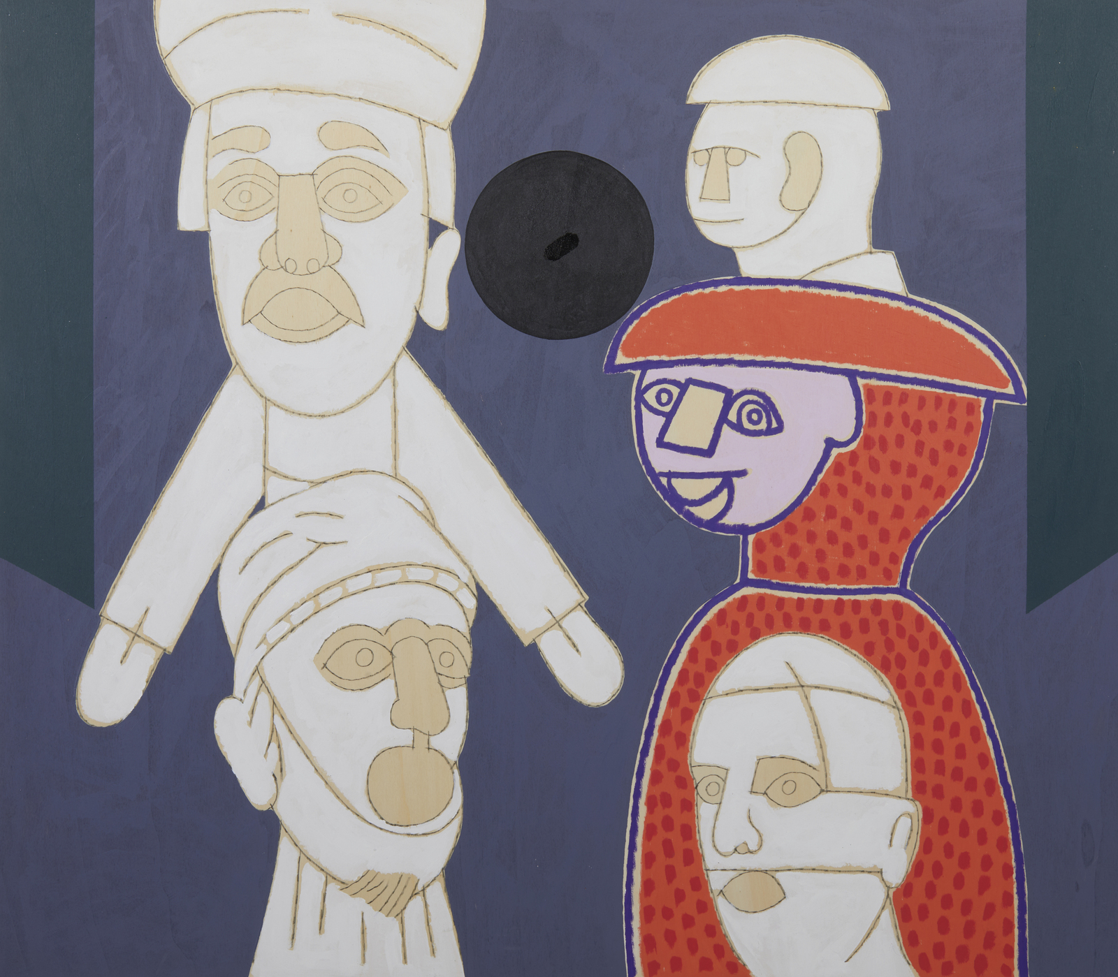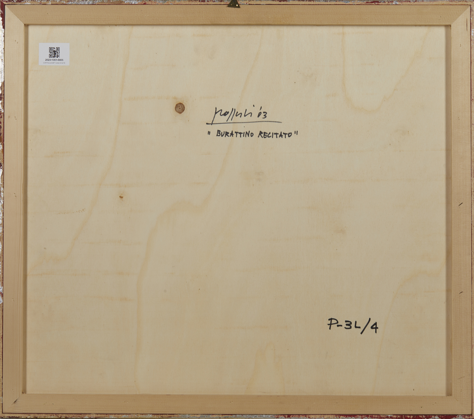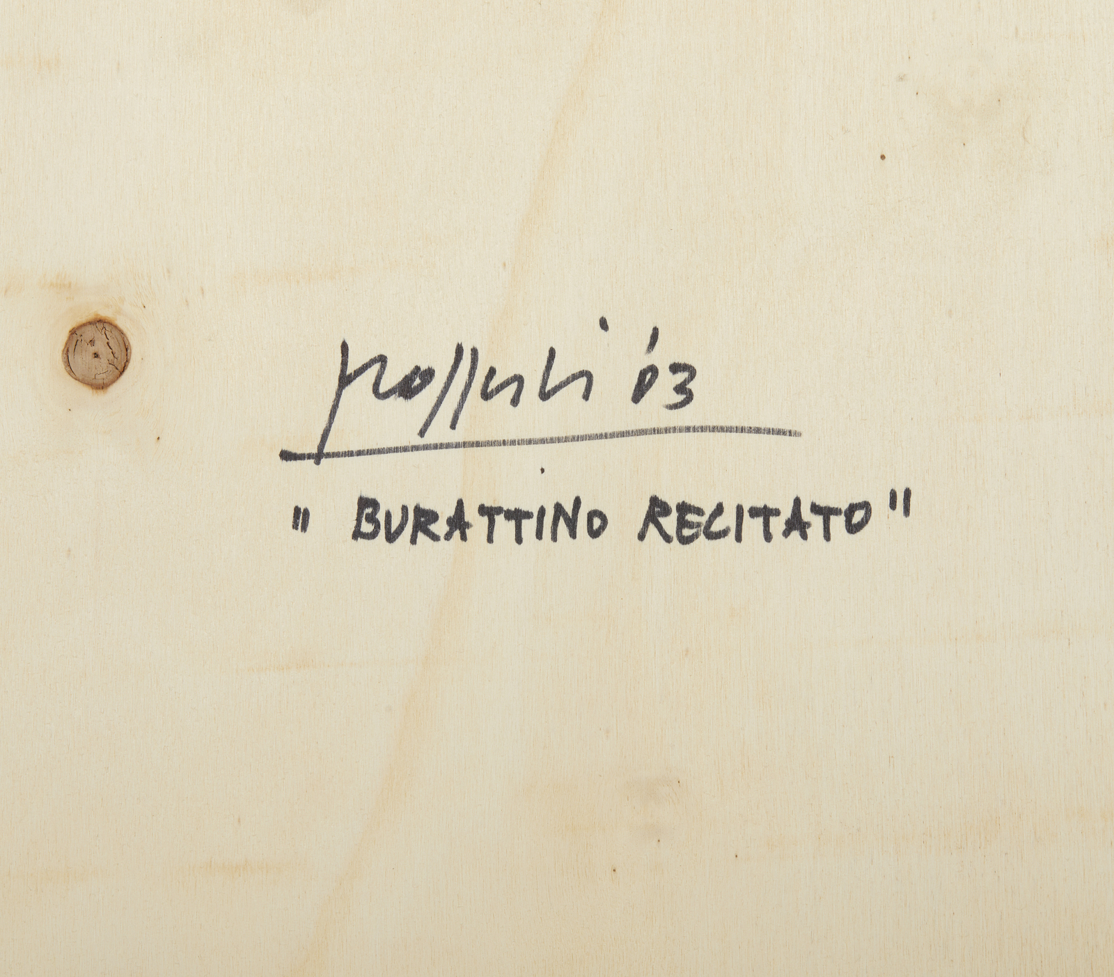 POZZATI CONCETTO (1935 - 2017) Burattino recitato. 2003. Olio su tavola. Cm 70,00 x 80,00. Al retro firma, titolo e anno. Opera archiviata presso l'Archivio Generale Concetto Pozzati, come da documentazione fotografica allegata all'opera, riportante il relativo numero d'inventario.