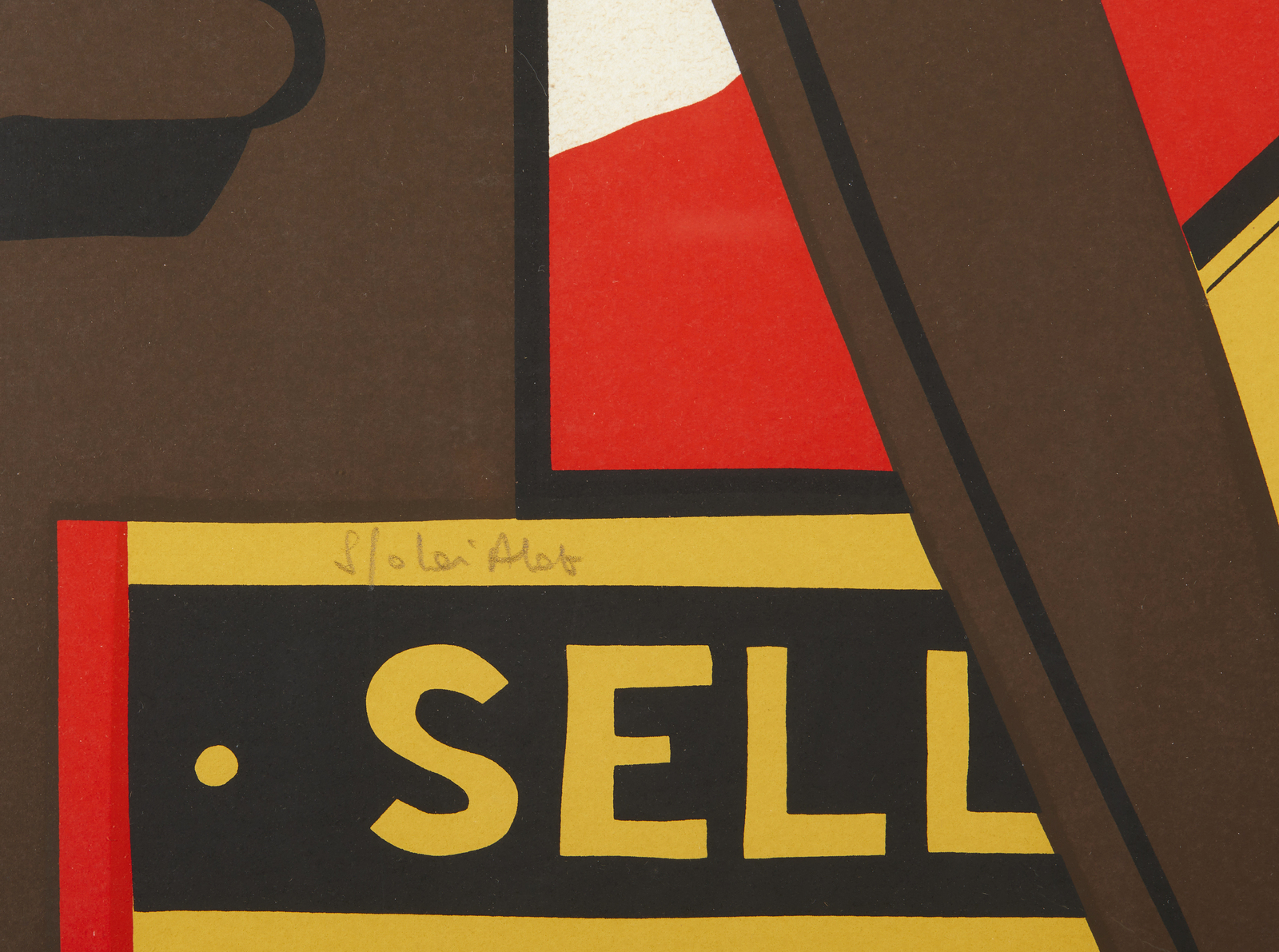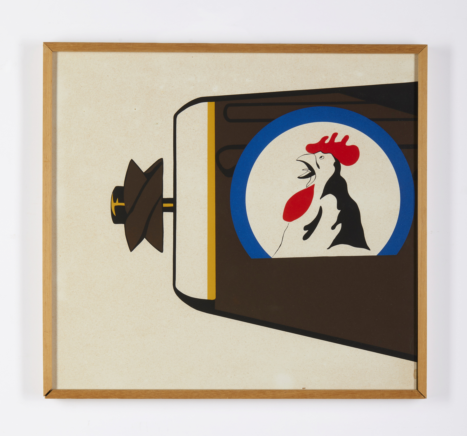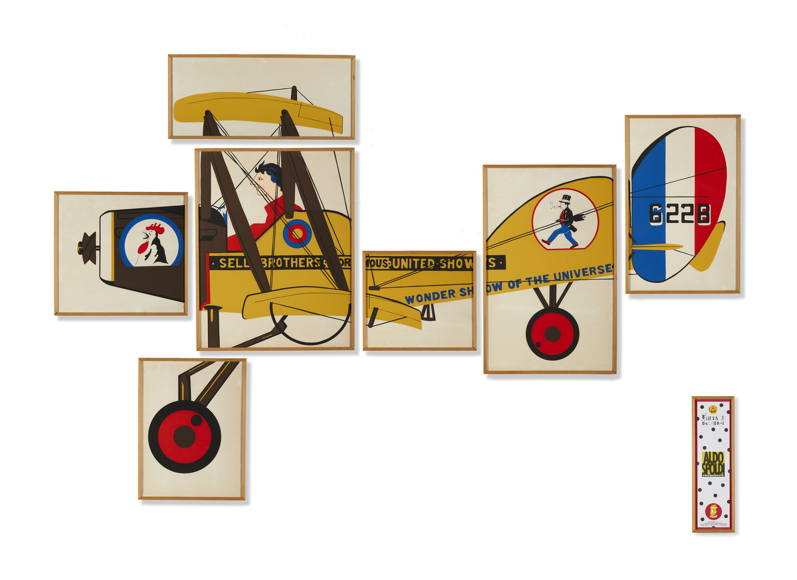 SPOLDI ALDO (n. 1949) Senza titolo (polittico). Serigrafia. Cm 201,00 x 130,00. Polittico composto da n.8 parti: Ruota anteriore: 42x31,5 cm; Parte anteriore: 39,5x36 cm; Parte centrale (I): 61x47 cm; Parte superiore: 24x56 cm; Parte centrale (II): 29x33 cm; Parte posteriore con ruota: 63x39,5 cm