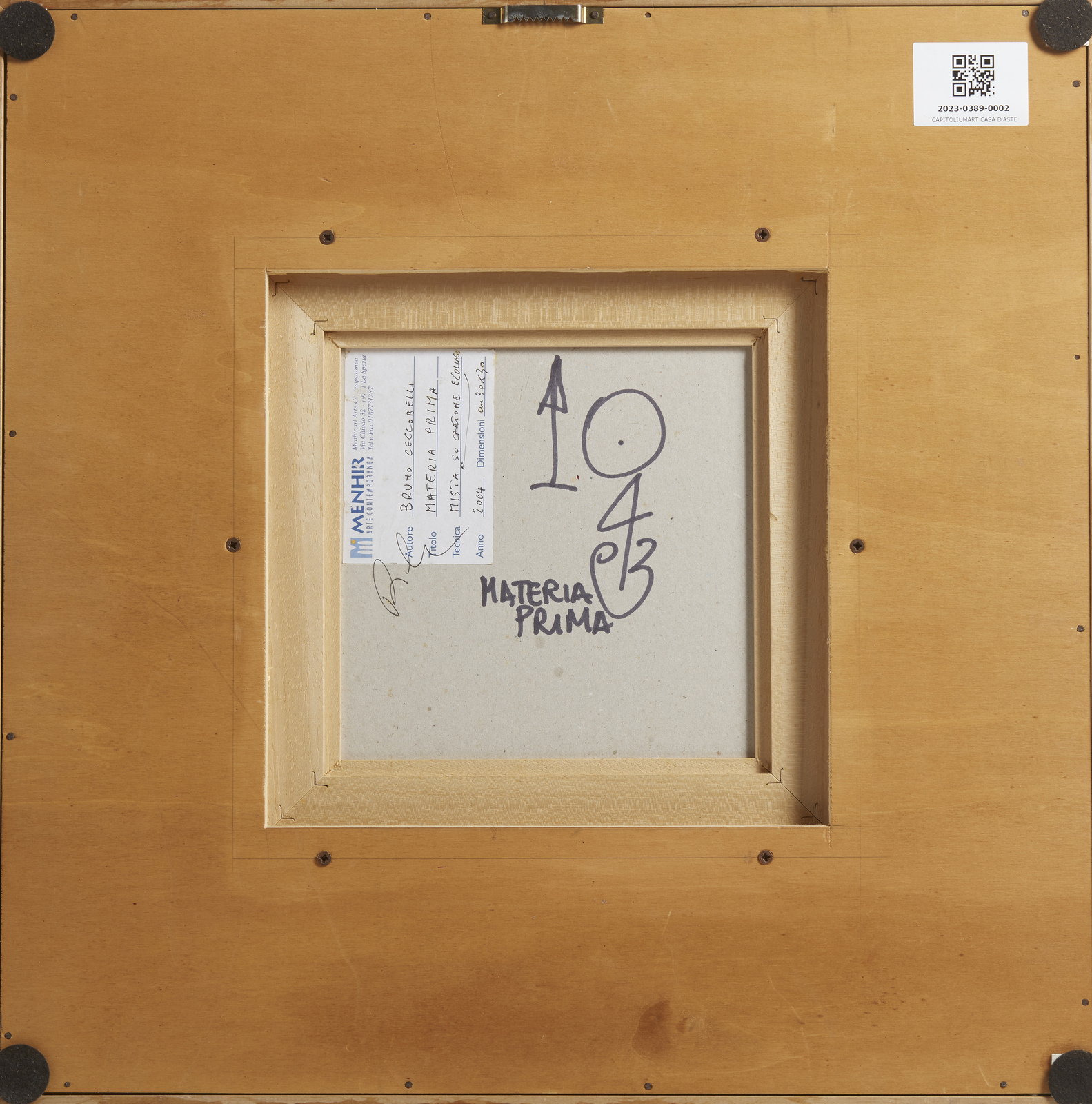 CECCOBELLI BRUNO (n. 1952) Materia prima. 2004. Tecnica mista e collage su cartone. Cm 30,00 x 30,00. Al retro titolo, firma, anno e etichetta Menhir Arte Contemporanea, La Spezia. Autentica dell'artista su fotografia con timbro Menhir Arte Contemporanea, La Spezia. Cornice presente