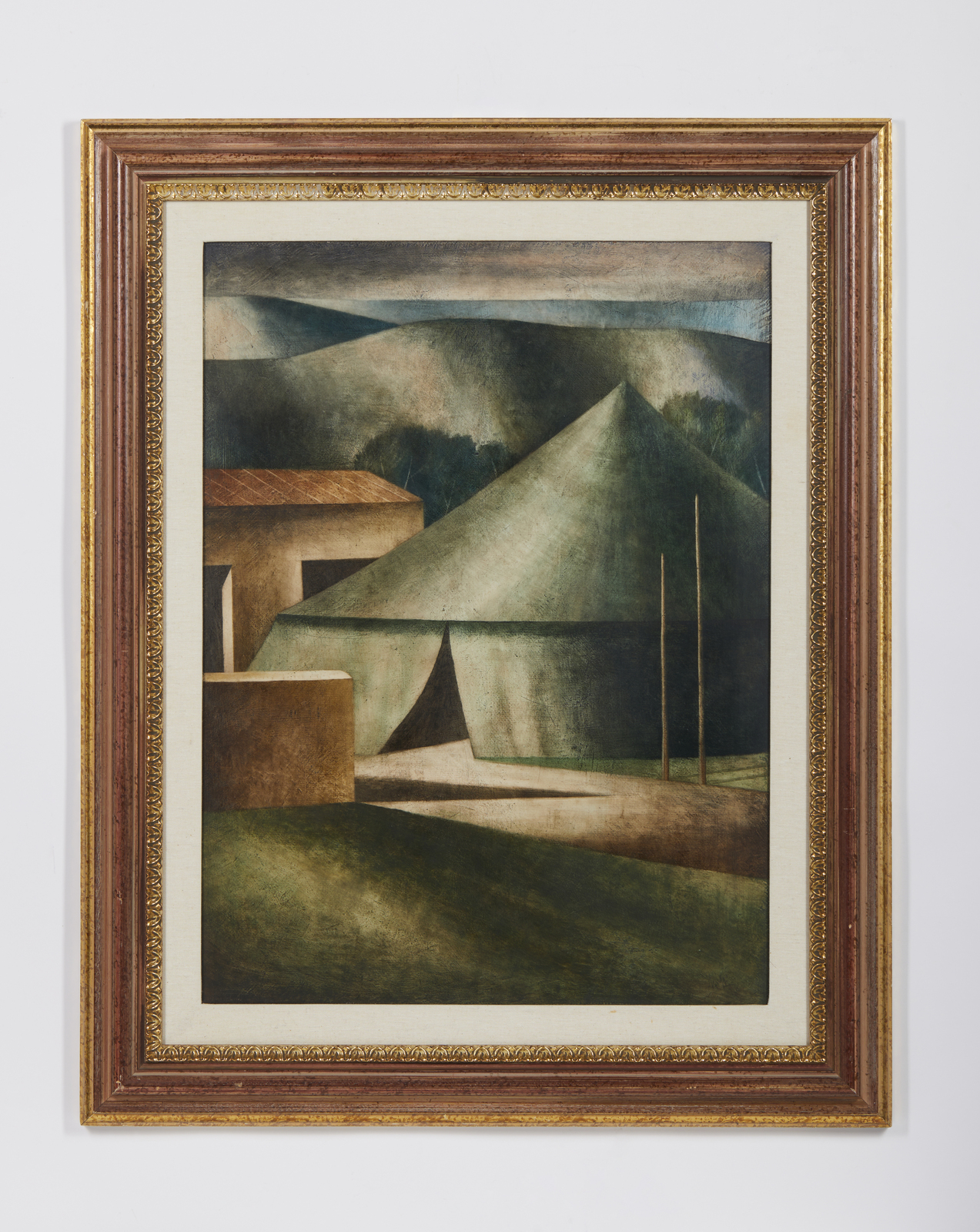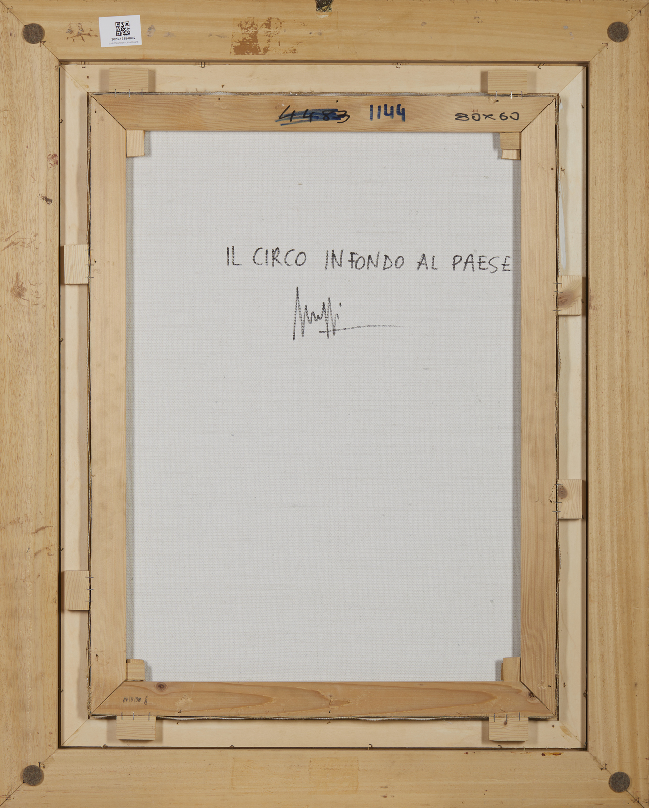 SCUFFI MARCELLO (n. 1948) Il circo in fondo al paese. Olio su tela . Cm 60,50 x 80,50. Firma in basso a sinistra. Al retro titolo e firma. Autentica dell'artista su fotografia con timbro Casa d'arte San Lorenzo. Cornice presente