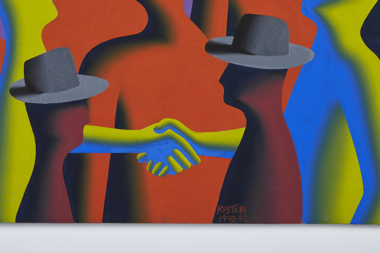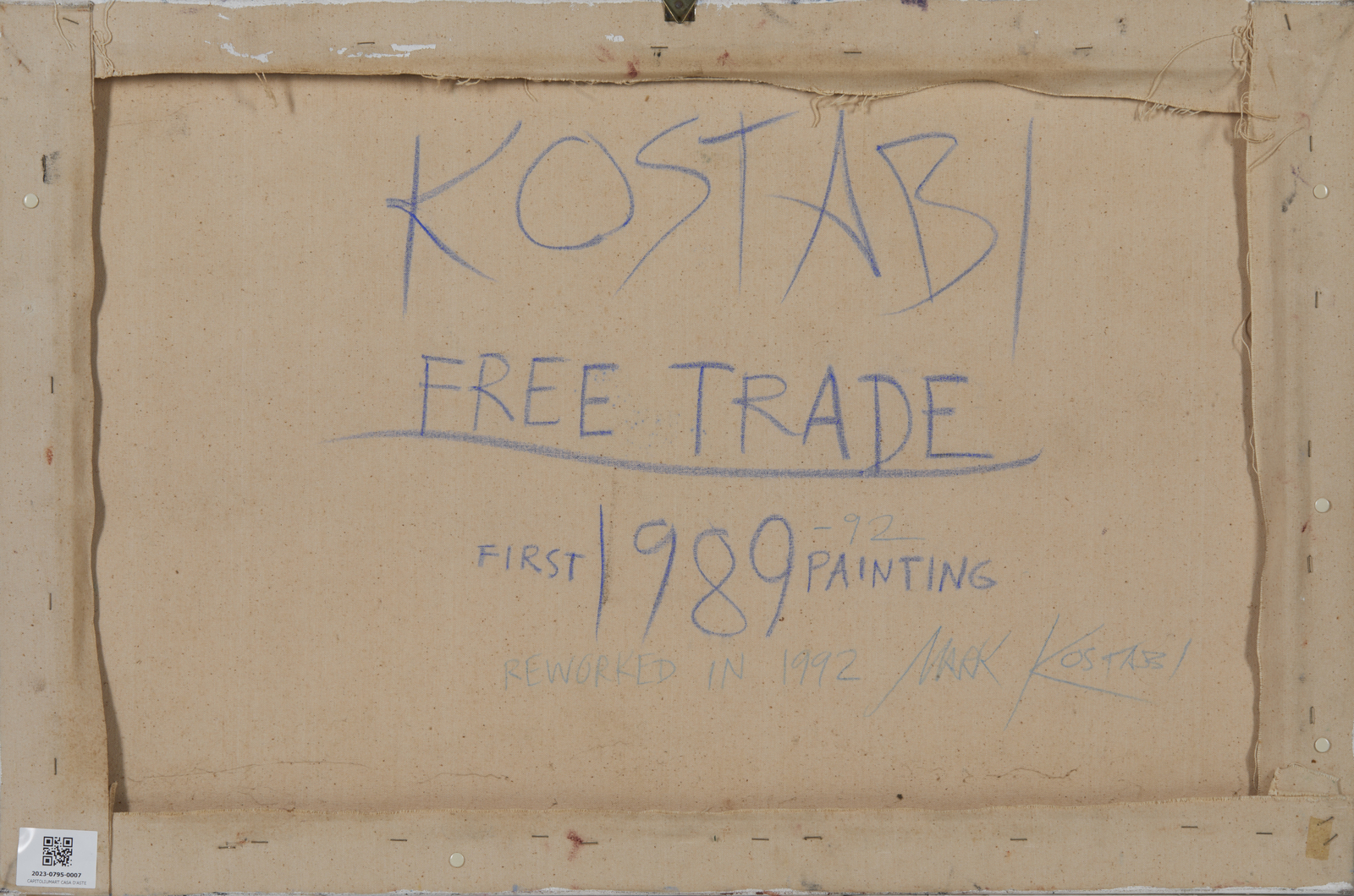 KOSTABI MARK (n. 1960) Free trade. Acrilico su tela. Cm 91,50 x 60,50. Firma e anno in basso a destra. Al retro firma, titolo e anno. 1989-1992. Difetti.