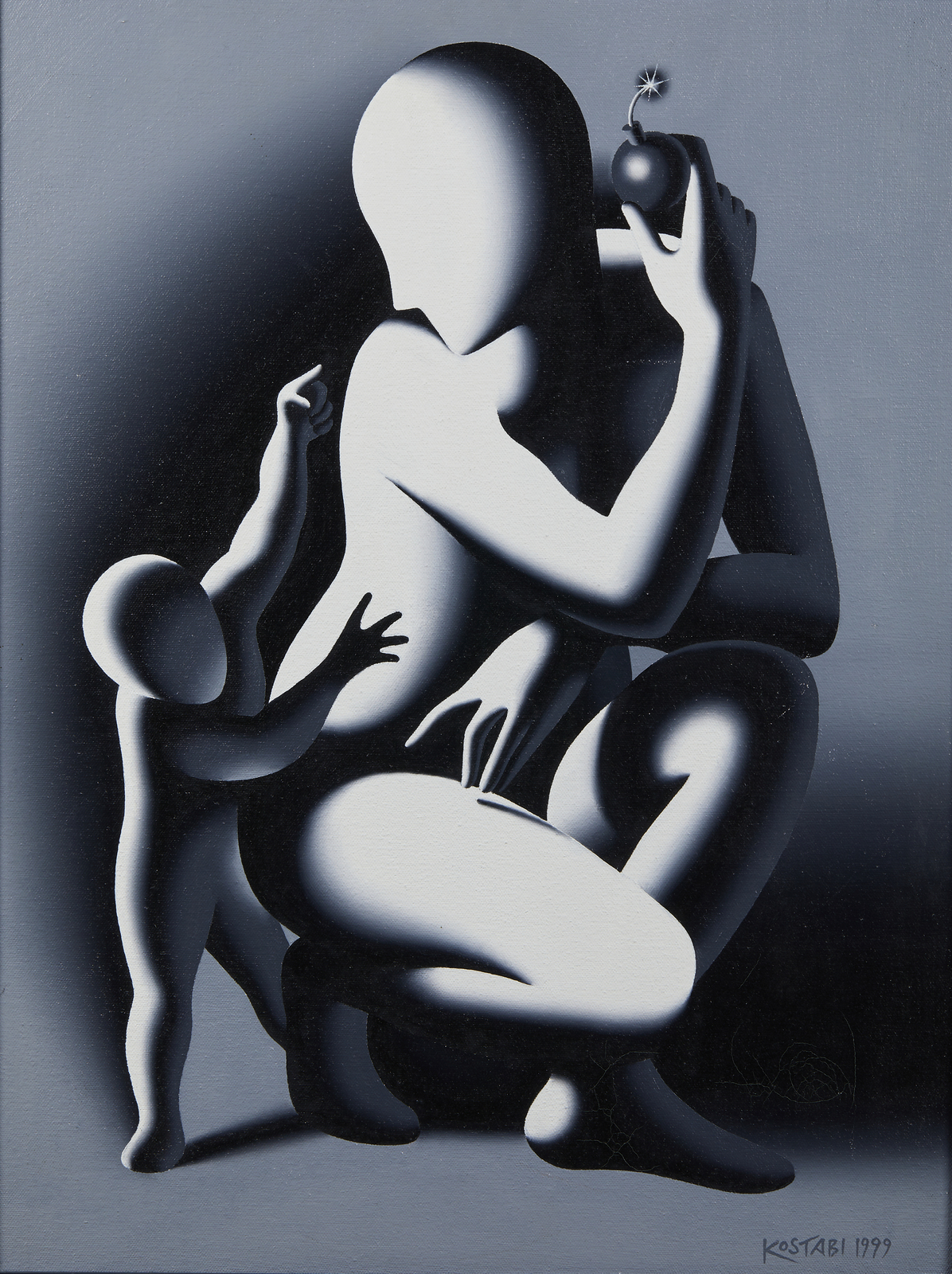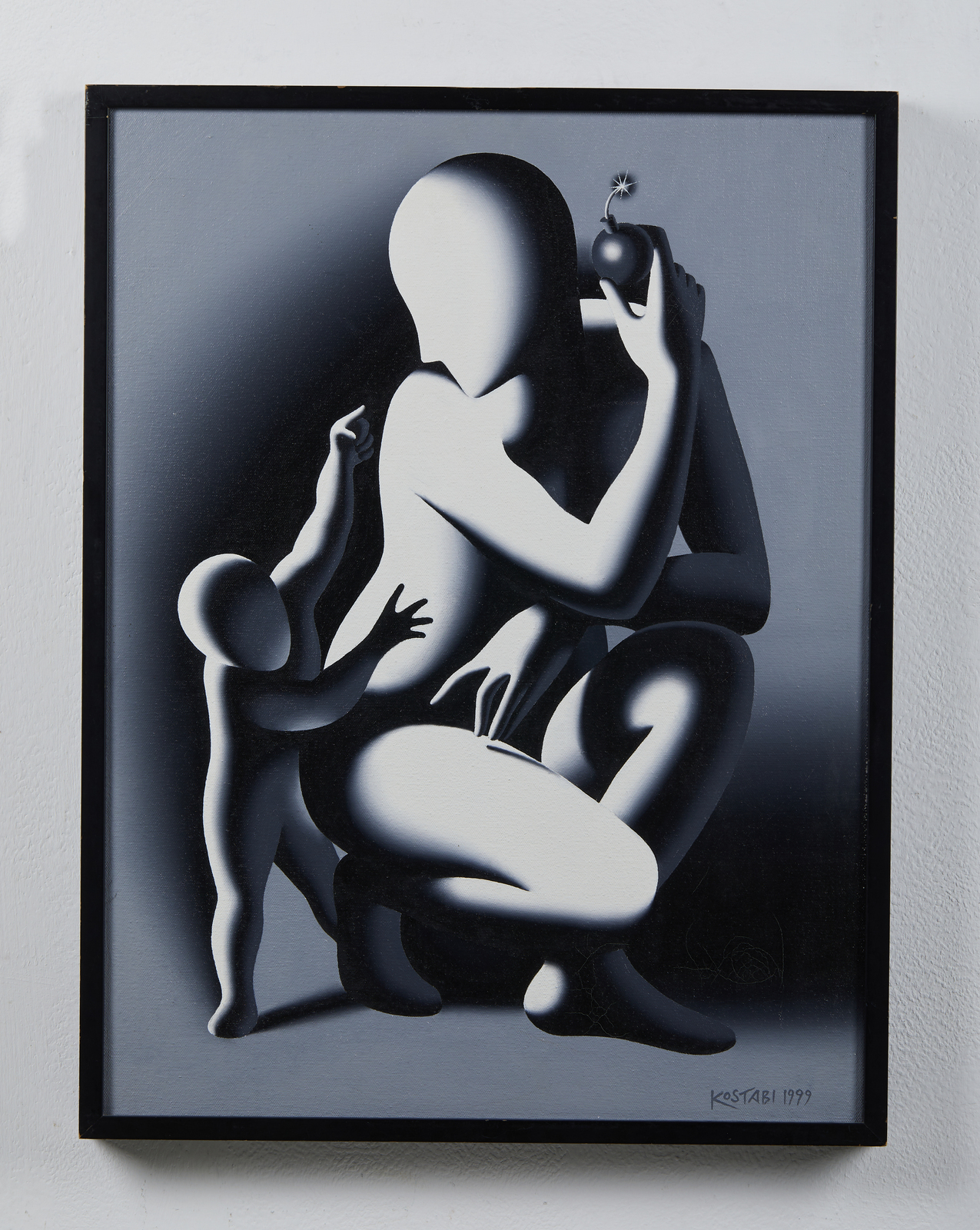KOSTABI MARK (n. 1960) It's the bomb. 1999. Olio su tela . Cm 41,00 x 65,00. Firma e anno in basso a destra. Al retro titolo, dedica, firma e anno. Certificato di autenticità e garanzia rilasciato da Galleria Spagnoli, Firenze. Provenienza: Galleria Spagnoli, Firenze; Collezione privata, Bergamo. Cornice presente