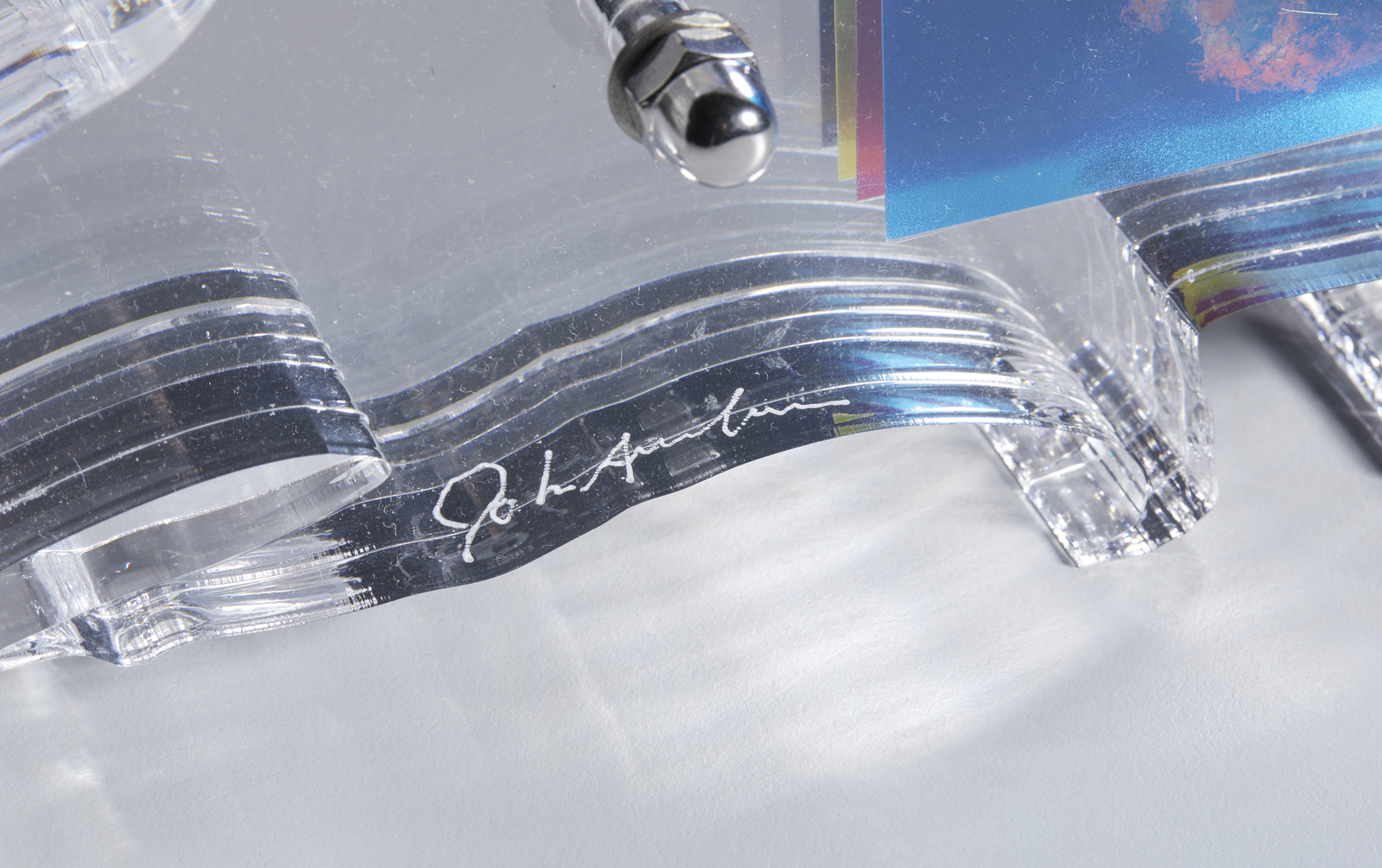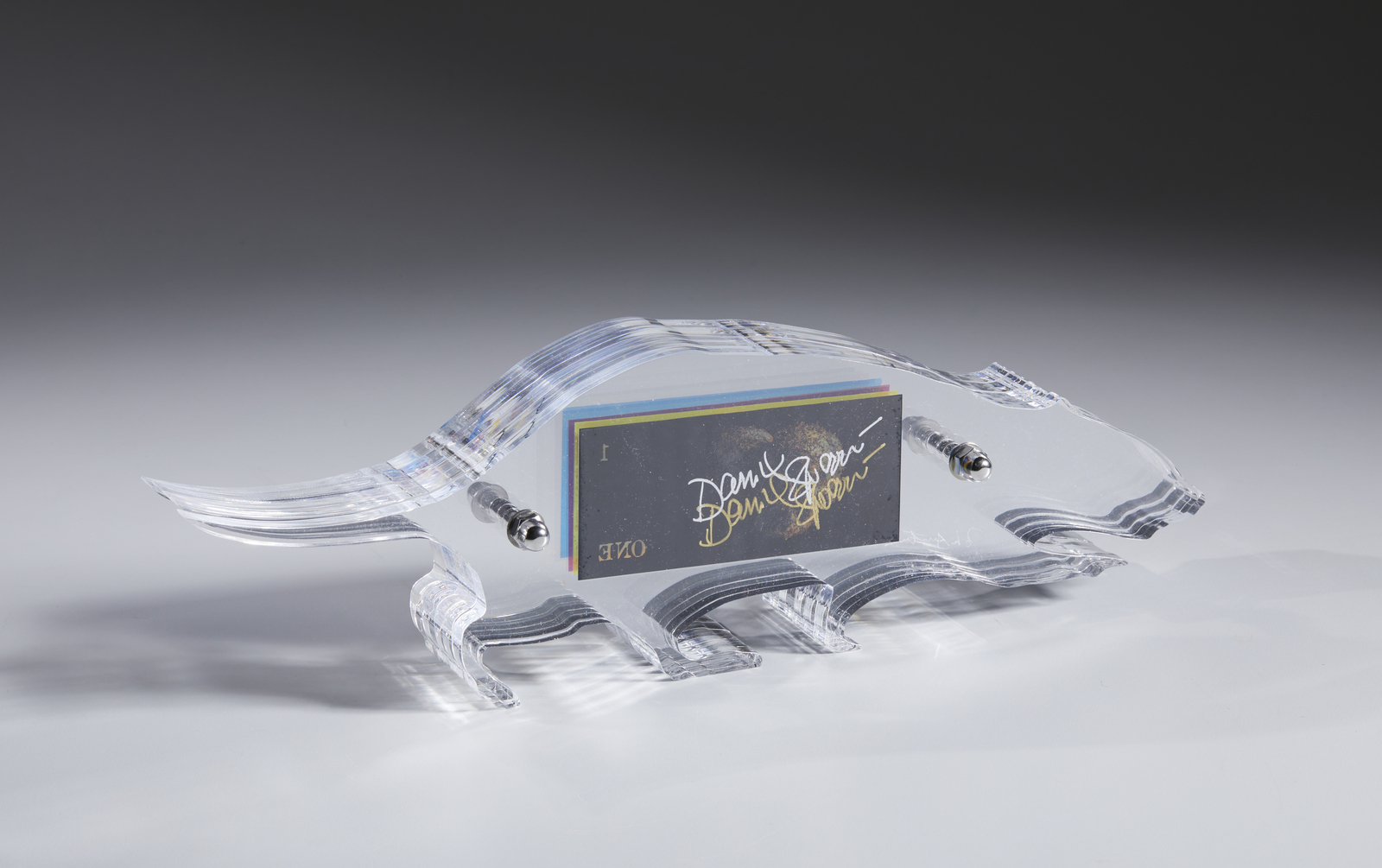 disegnata, realizzata e firmata a mezzo incisione da John Armleder contenente al suo interno 4 pellicole originali per la selezione dei colori (giallo, nero, magenta e ciano) firmate in originale da Daniel Spoerri. 2 banconote in formato gigante, stampate in litografia su carta filigranata (utilizzando le suddette pellicole), anch’esse firmate in originale da Daniel Spoerri.