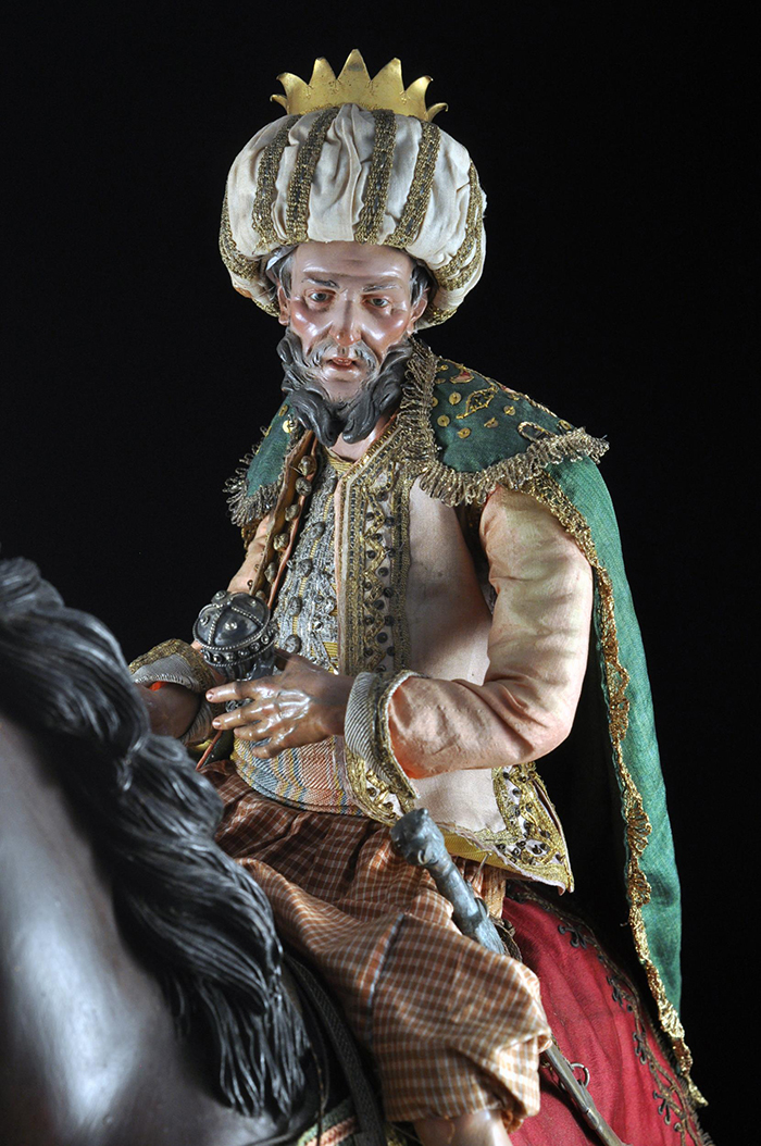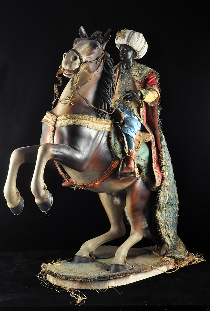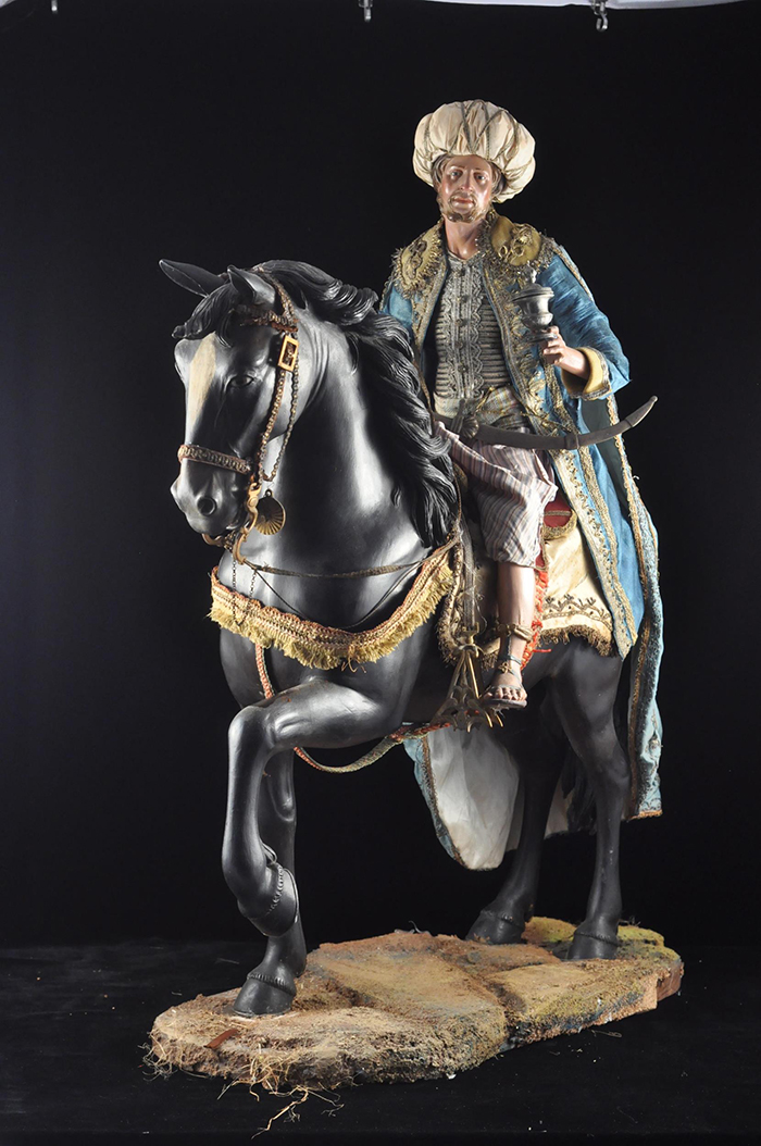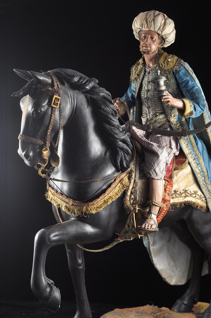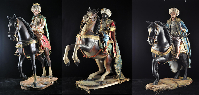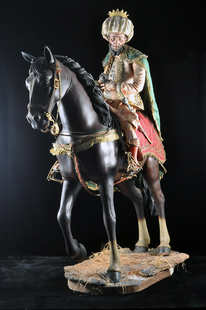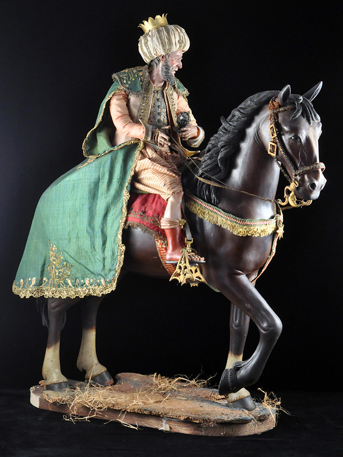I tre Re Magi Gaspare, il re giovane, attr. L. Mosca h cm 38 Cavallo al passo attr. S. Vassallo terracotta policroma, zampe in legno policromo,occhi in vetro, cm 50x46,5 Baldassarre, il re moro, attr. L. Mosca h cm 38 Cavallo rampante attr. S. Vassallo terracotta policroma, zampe in legno policromo,occhi in vetro, cm 48x48 Melchiorre, il re anziano, attr. L. Mosca h cm 38 Cavallo al passo attr. S. Vassallo terracotta policroma, zampe in legno policromo,occhi in vetro, cm 53,5x46 Napoli XVIII - XIX secolo Provenienza: Roberto Campobasso Antichità, Napoli; coll. privata, Napoli