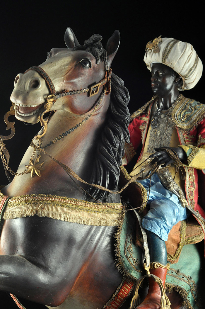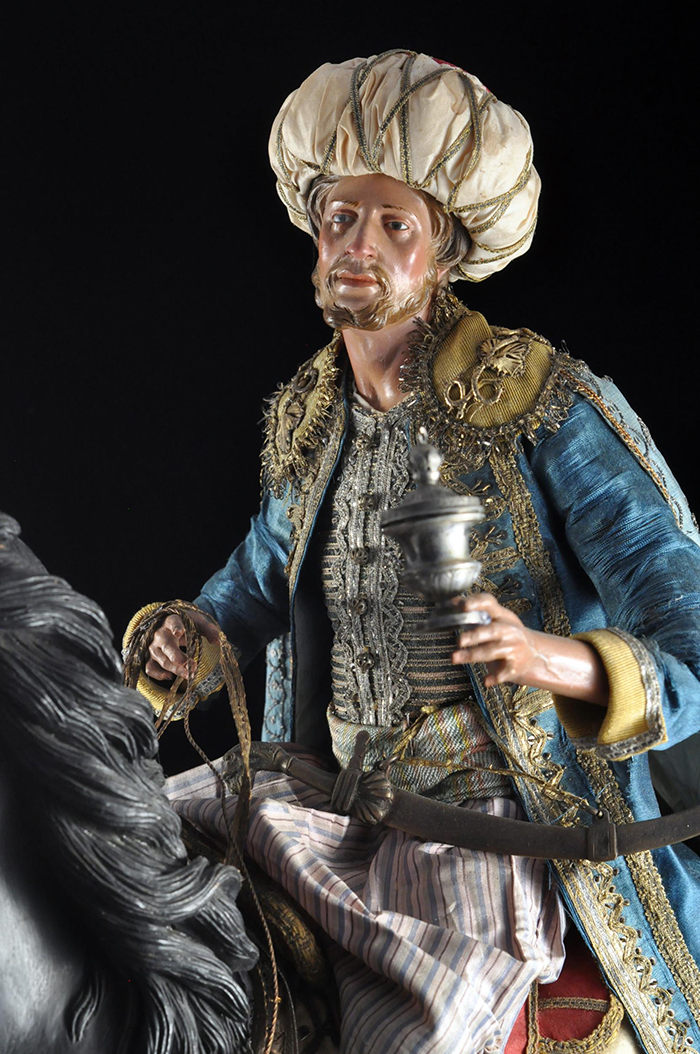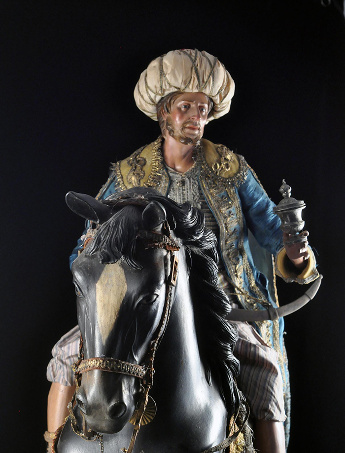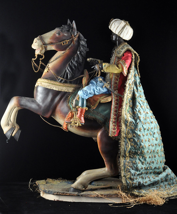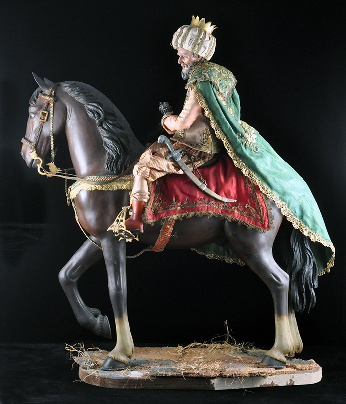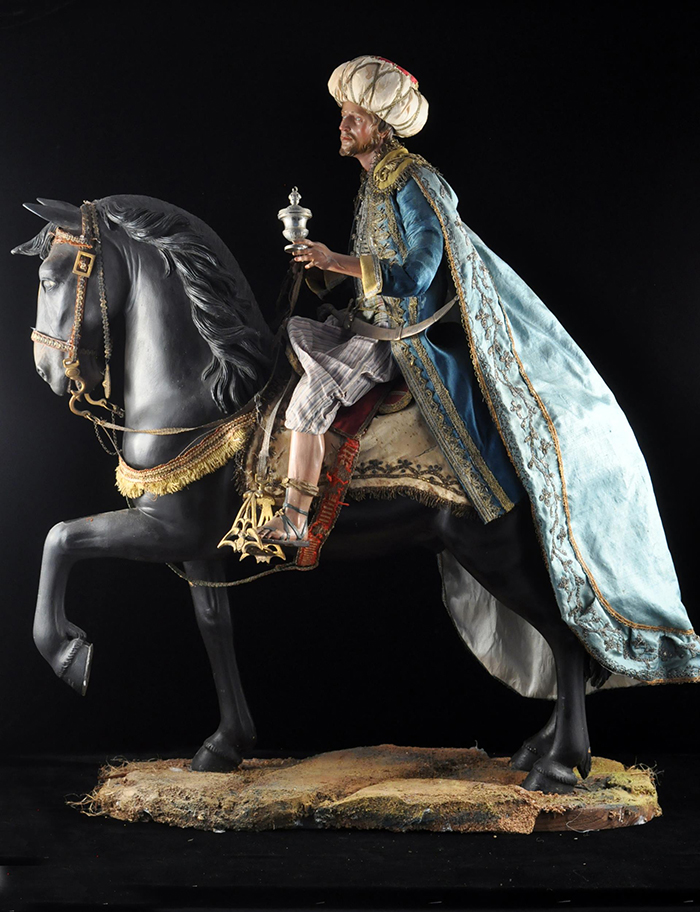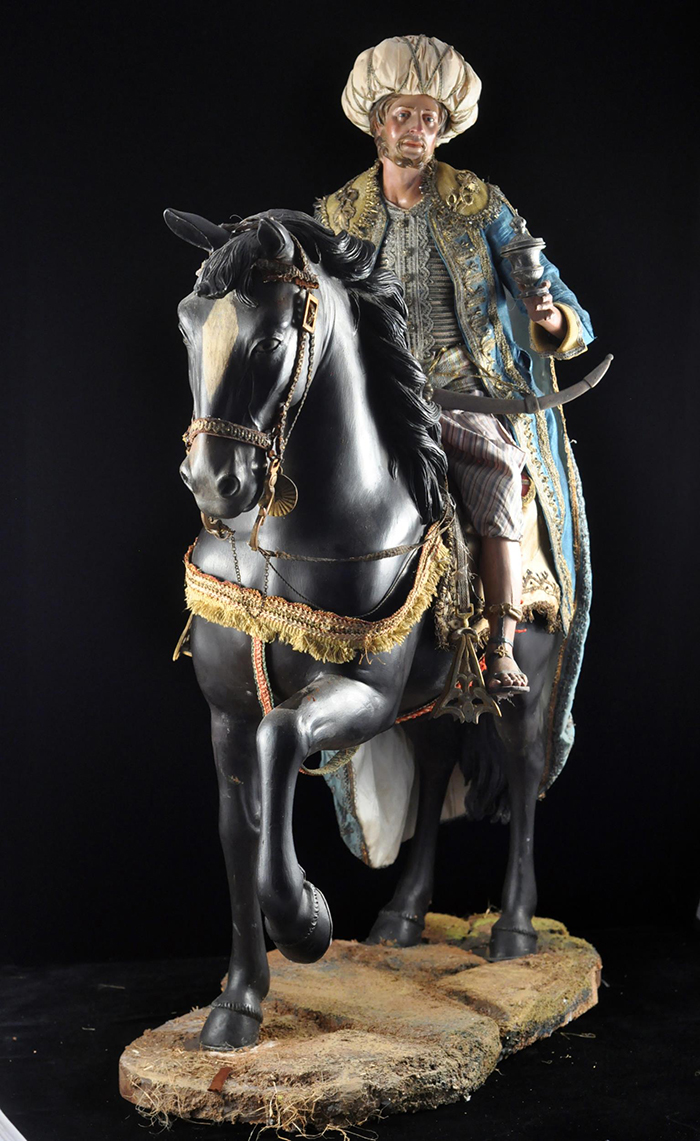 I tre Re Magi Gaspare, il re giovane, attr. L. Mosca h cm 38 Cavallo al passo attr. S. Vassallo terracotta policroma, zampe in legno policromo,occhi in vetro, cm 50x46,5 Baldassarre, il re moro, attr. L. Mosca h cm 38 Cavallo rampante attr. S. Vassallo terracotta policroma, zampe in legno policromo,occhi in vetro, cm 48x48 Melchiorre, il re anziano, attr. L. Mosca h cm 38 Cavallo al passo attr. S. Vassallo terracotta policroma, zampe in legno policromo,occhi in vetro, cm 53,5x46 Napoli XVIII - XIX secolo Provenienza: Roberto Campobasso Antichità, Napoli; coll. privata, Napoli
