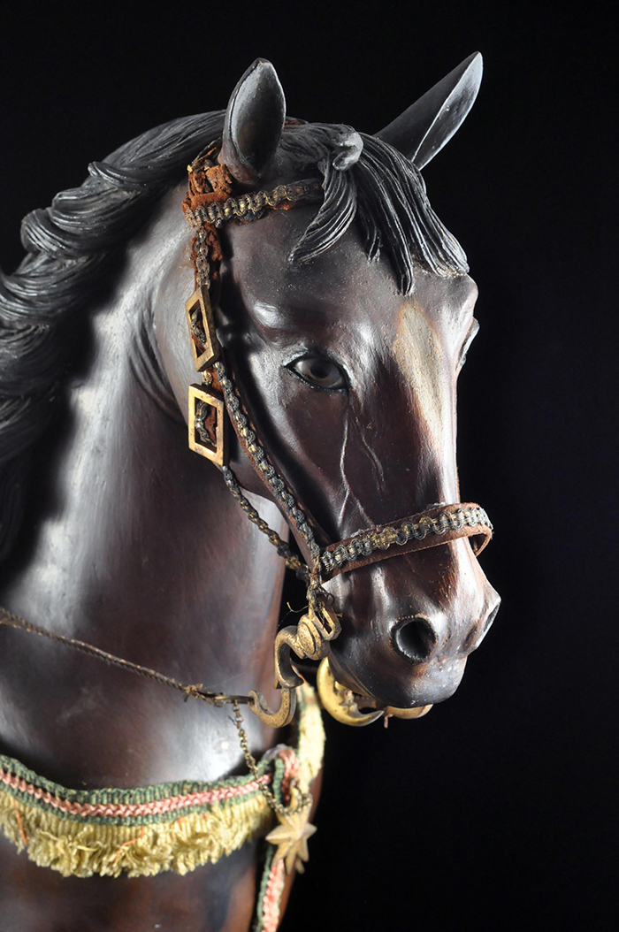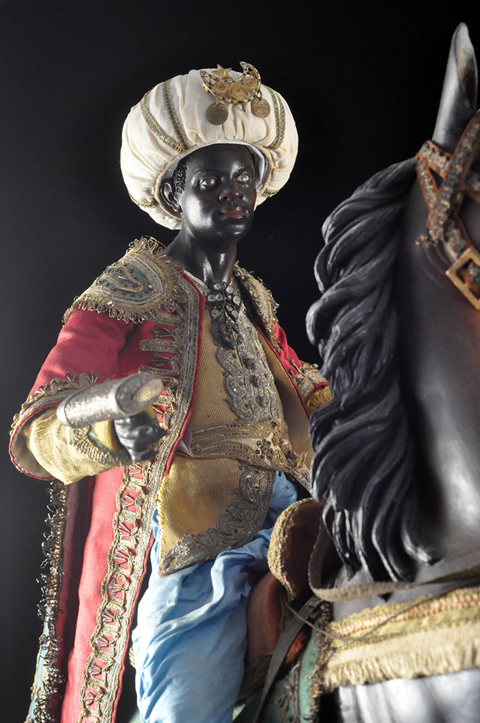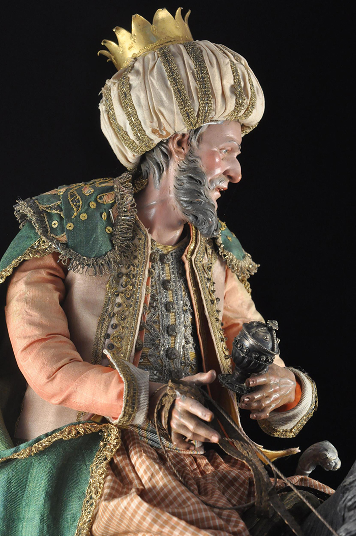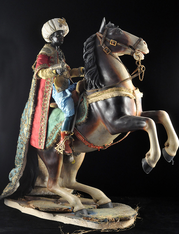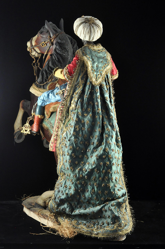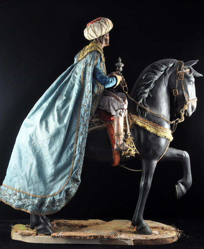 I tre Re Magi Gaspare, il re giovane, attr. L. Mosca h cm 38 Cavallo al passo attr. S. Vassallo terracotta policroma, zampe in legno policromo,occhi in vetro, cm 50x46,5 Baldassarre, il re moro, attr. L. Mosca h cm 38 Cavallo rampante attr. S. Vassallo terracotta policroma, zampe in legno policromo,occhi in vetro, cm 48x48 Melchiorre, il re anziano, attr. L. Mosca h cm 38 Cavallo al passo attr. S. Vassallo terracotta policroma, zampe in legno policromo,occhi in vetro, cm 53,5x46 Napoli XVIII - XIX secolo Provenienza: Roberto Campobasso Antichità, Napoli; coll. privata, Napoli