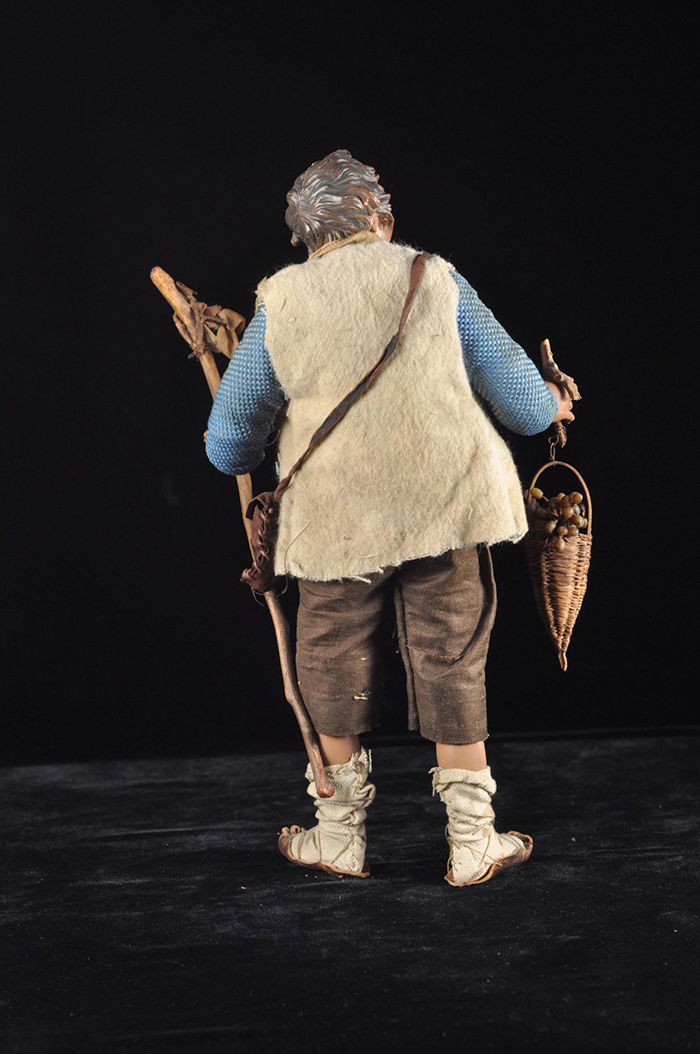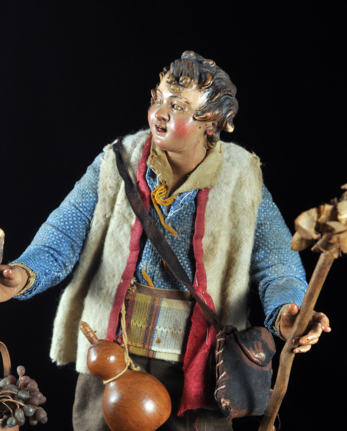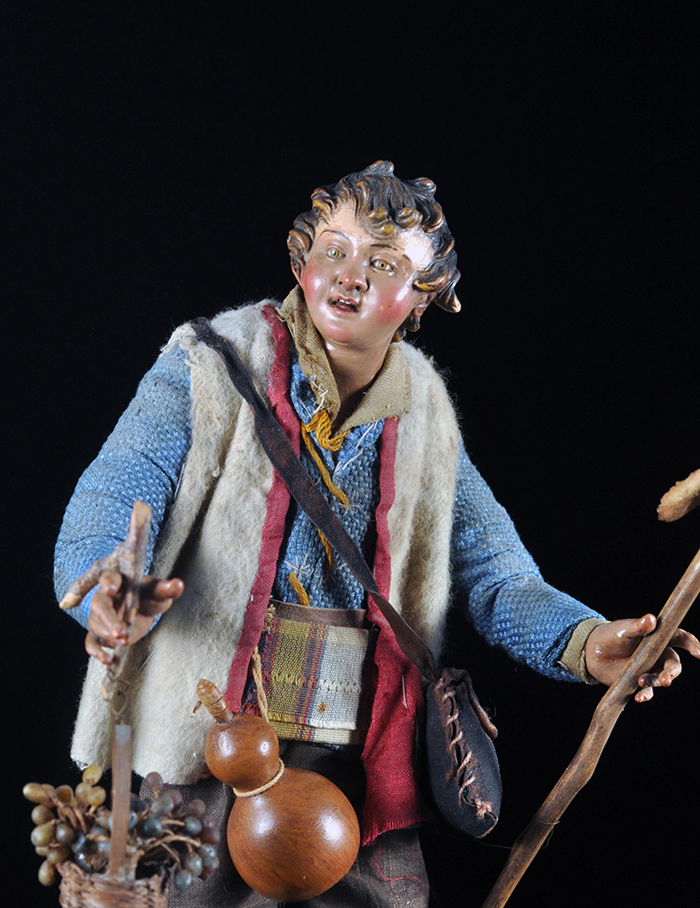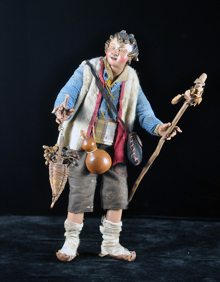 Bambino rustico h. cm 37 accessori: cestino, tracolla, bastone e fiaschetta Napoli XVIII - XIX secolo