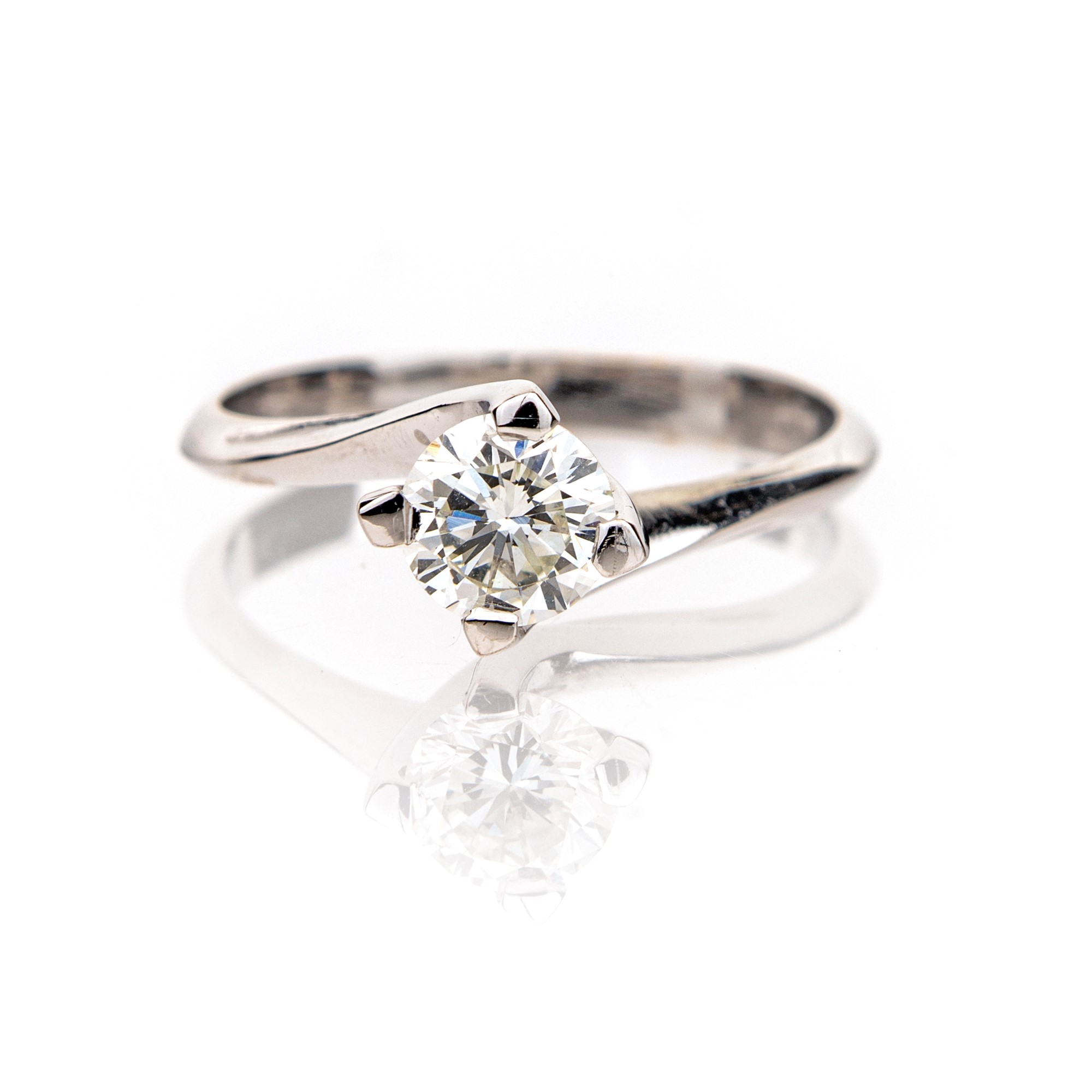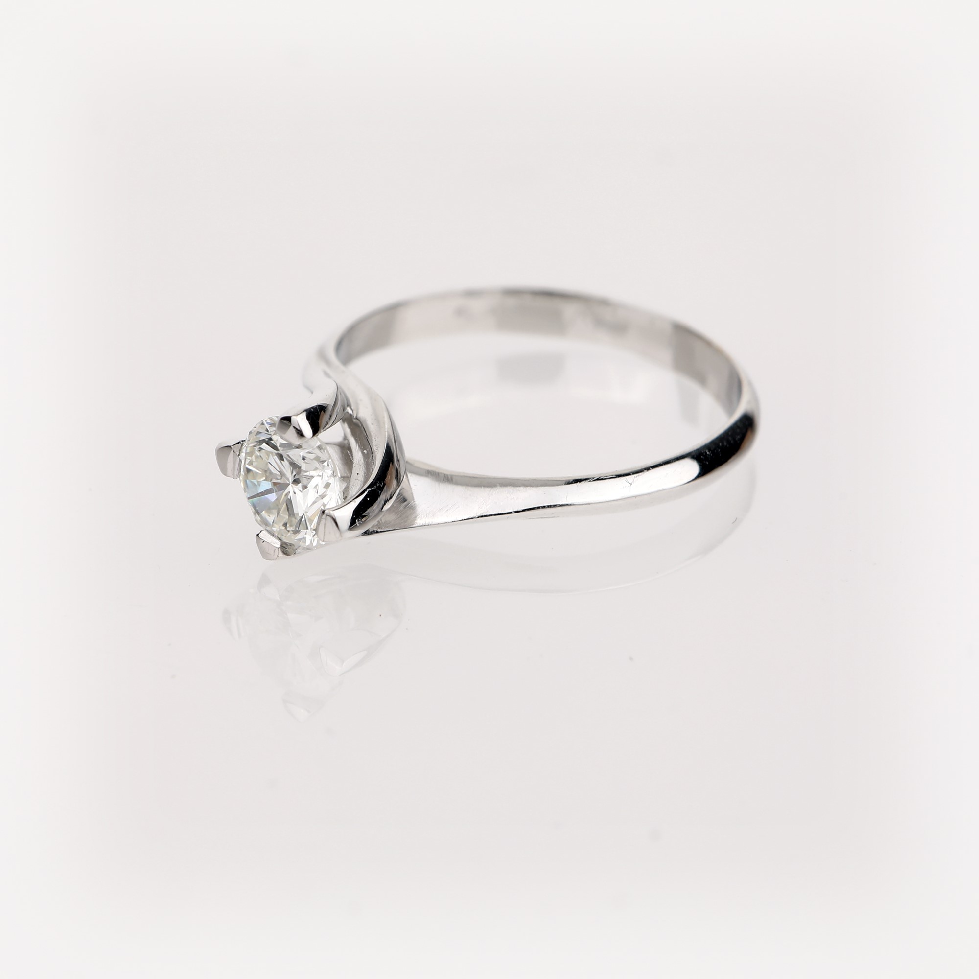 Anello in oro e brillante Misura 15 Oro bianco 750/000. Diamante in taglio rotondo brillante ct. 0,75 ca, prob. H-VVS. Peso complessivo gr. 2,50