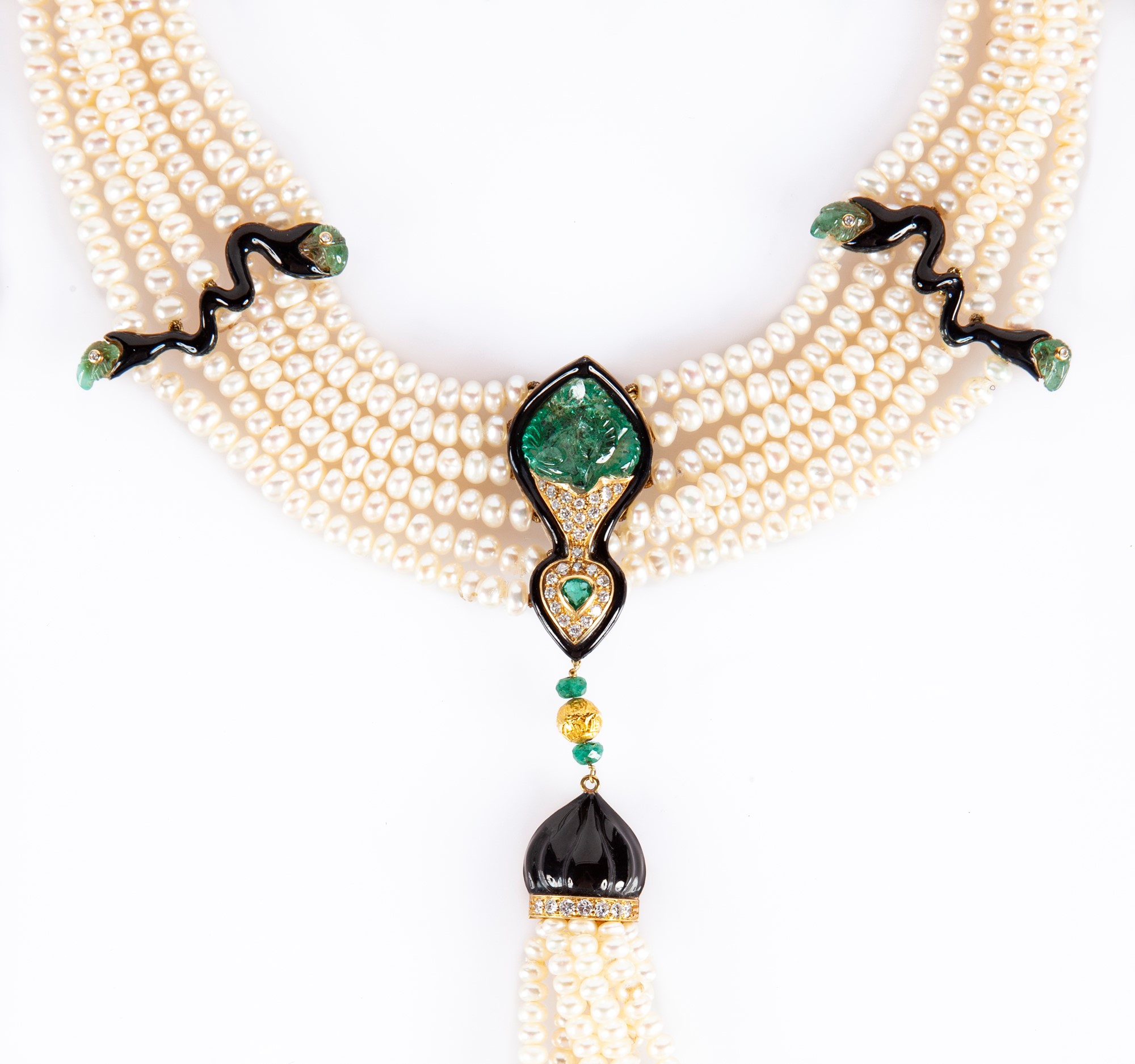 Collana di perle, smeraldi incisi, brillanti e smalti