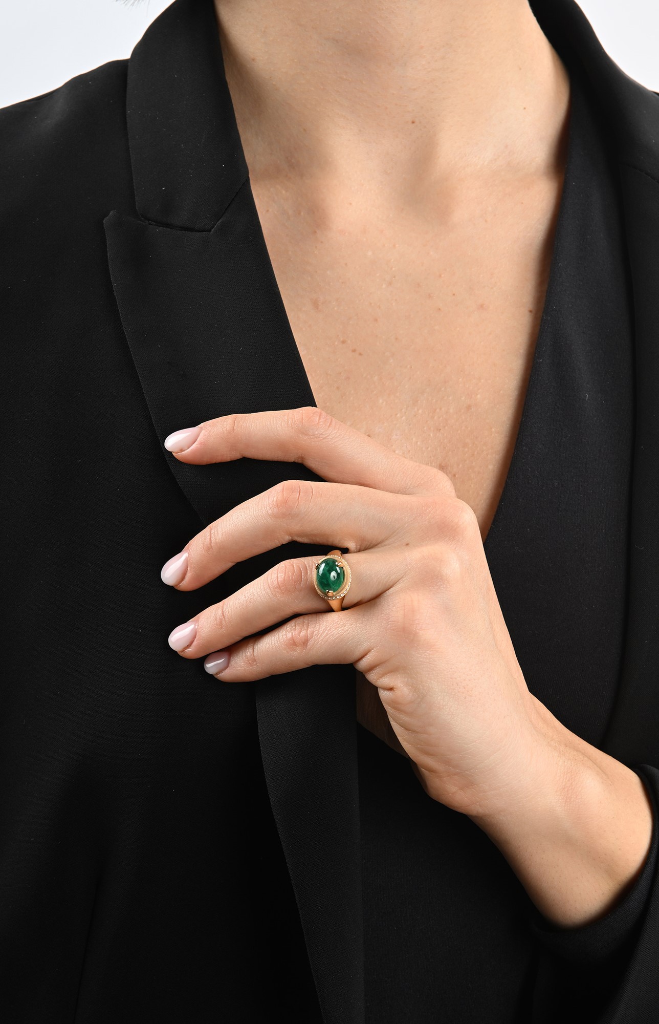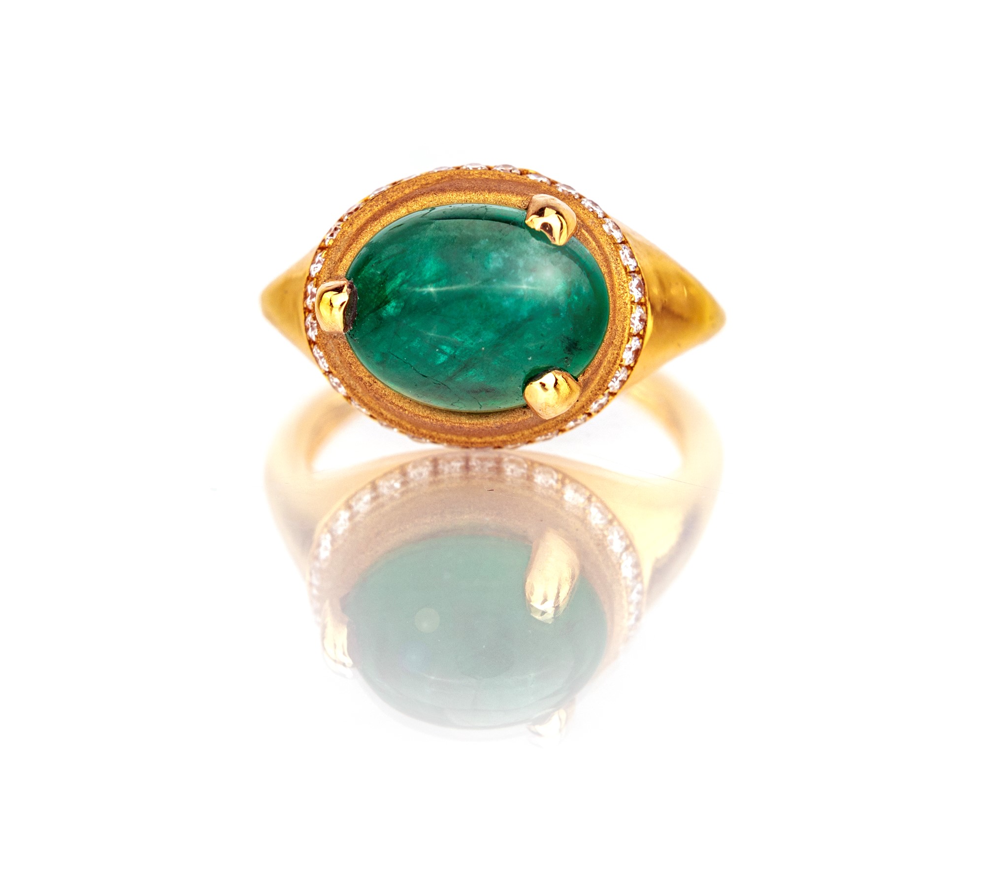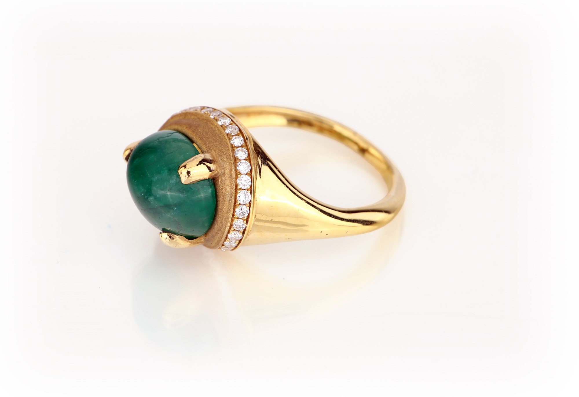 Anello in oro smeraldo e brillanti. Misura 9 Oro giallo 750/000. Smeraldo naturale in taglio cabochon ct. 3,40 ca., diamanti in taglio rotondo brillante. Peso complessivo gr. 7,30