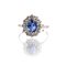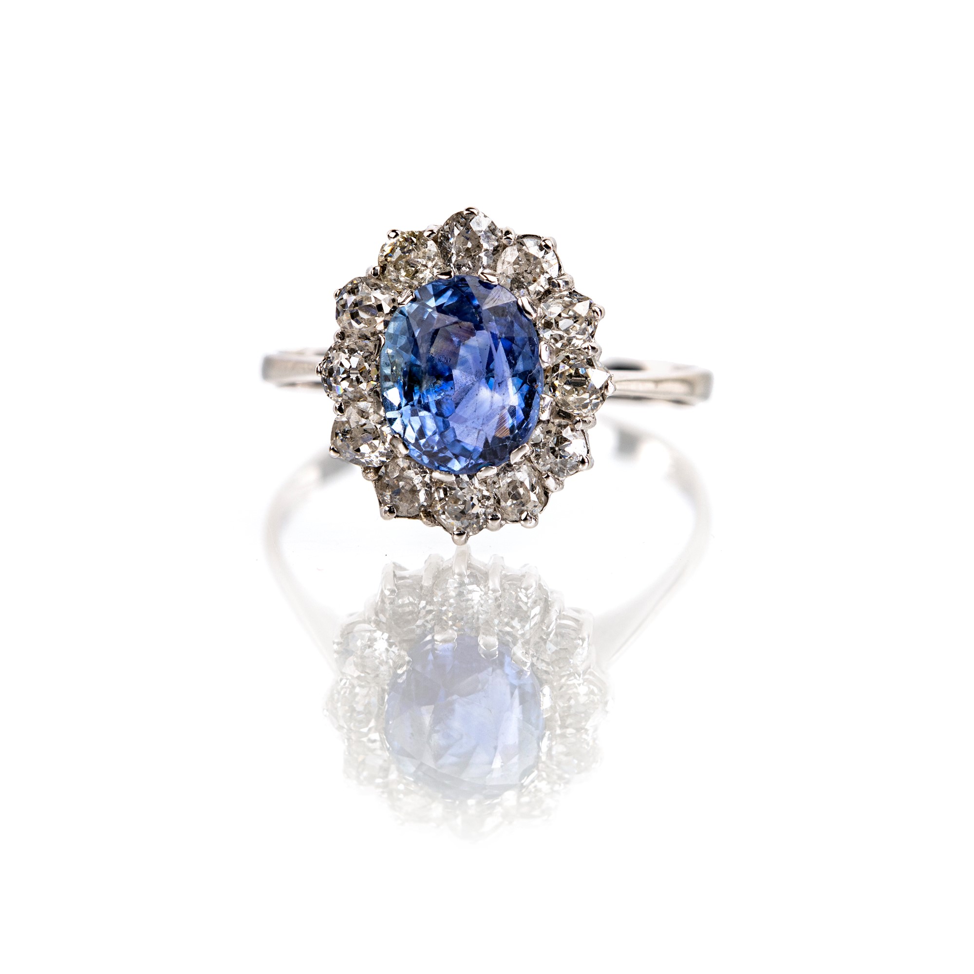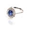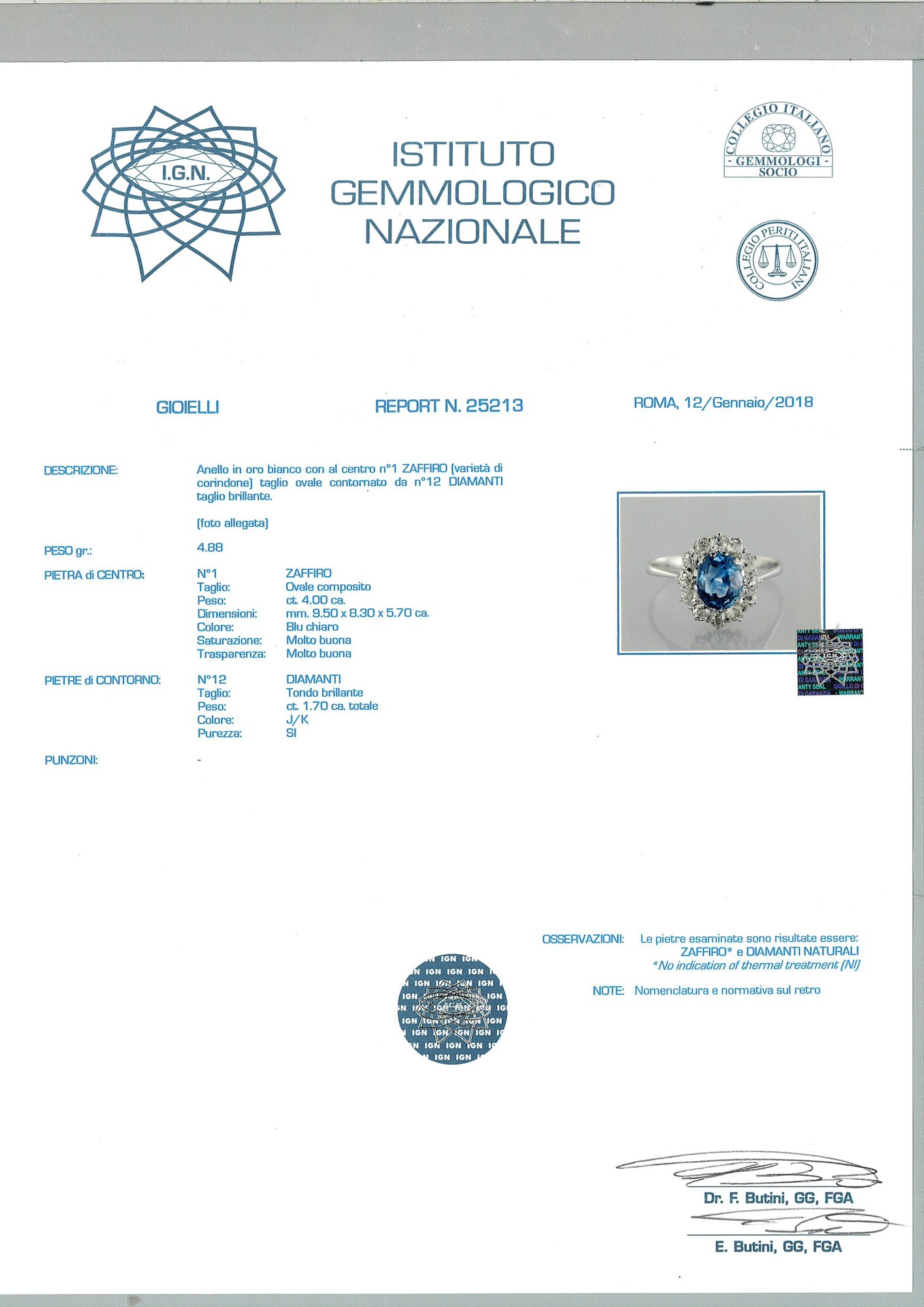 Anello in oro zaffiro e brillanti Misura 26 Oro bianco 750/000. Zaffiro naturale in taglio ovale ct. 4, diamanti in taglio rotondo brillante ct. 1,70, J-K, SI. Peso complessivo gr. 4,80. Corredato di certificazione gemmologica.