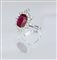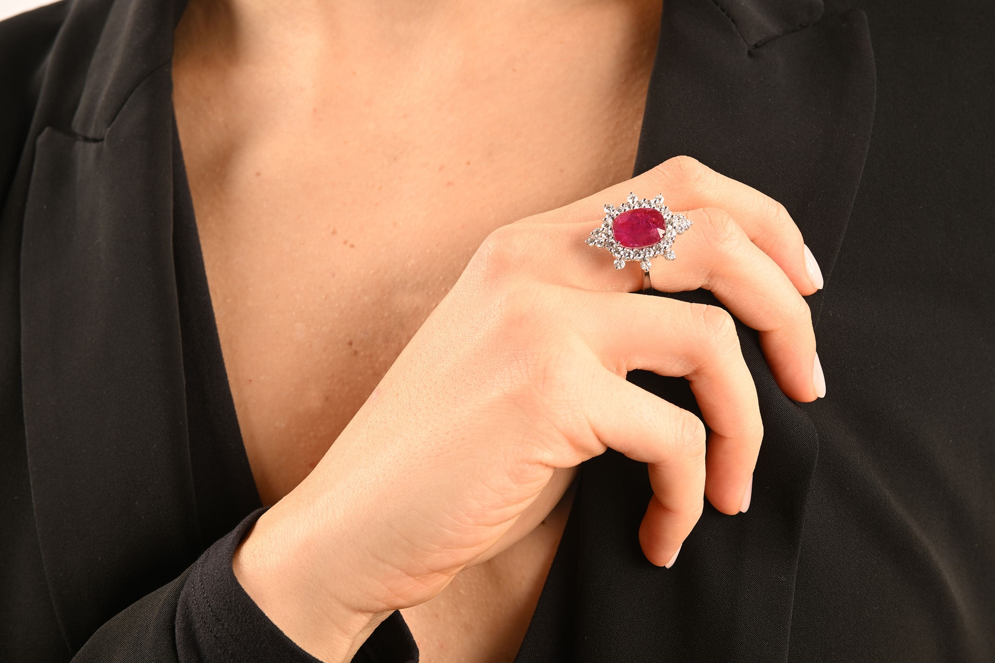 Anello in oro rubino e brillanti Misura 16 Oro bianco 750/000. Rubino naturale in taglio ovale ct. 5,02, senza indicazione di trattamento termico, diamanti in taglio rotondo brillante ct. 1,50 ca. G, VVS-VS. Peso complessivo gr. 10,30. Corredato di certificazione gemmologica.
