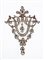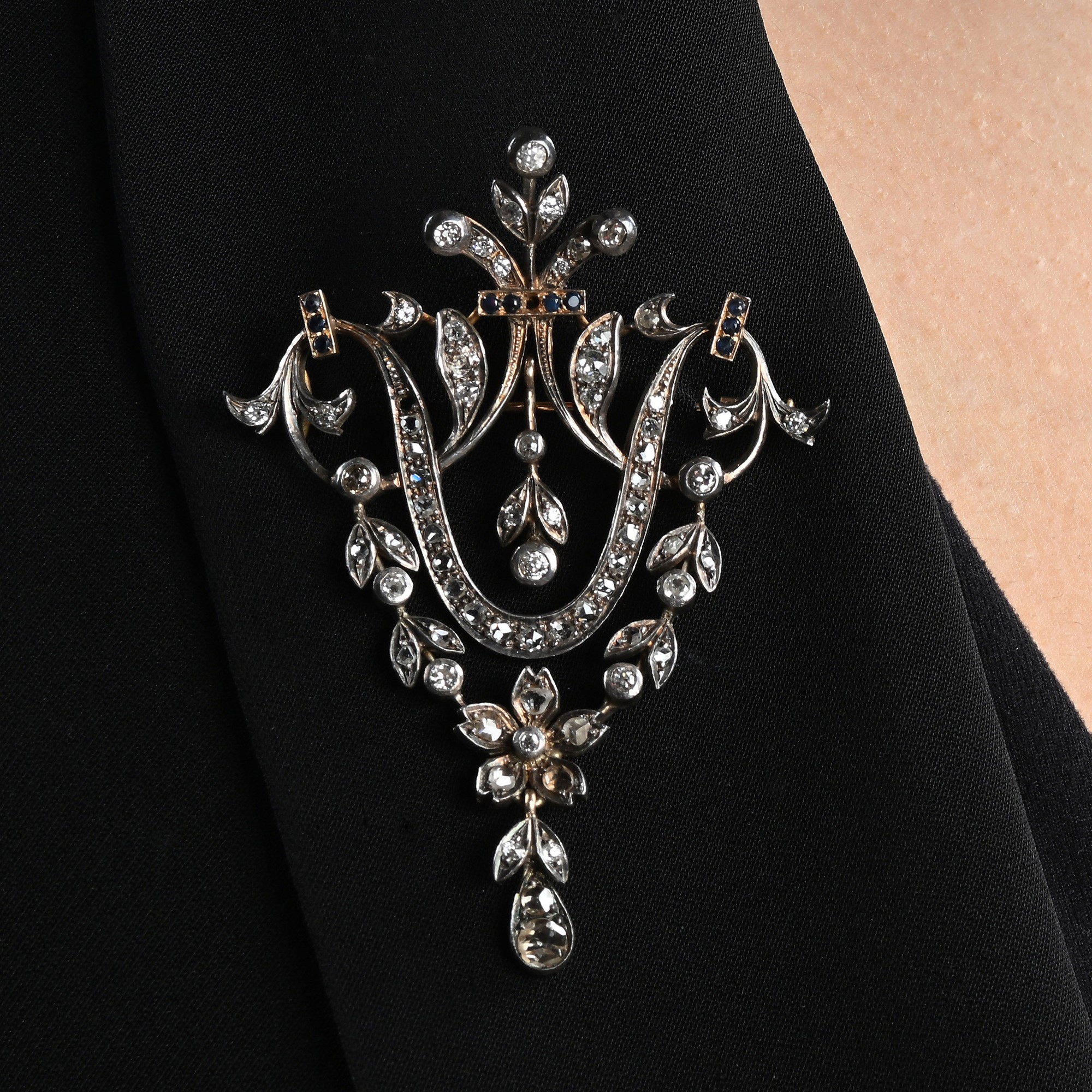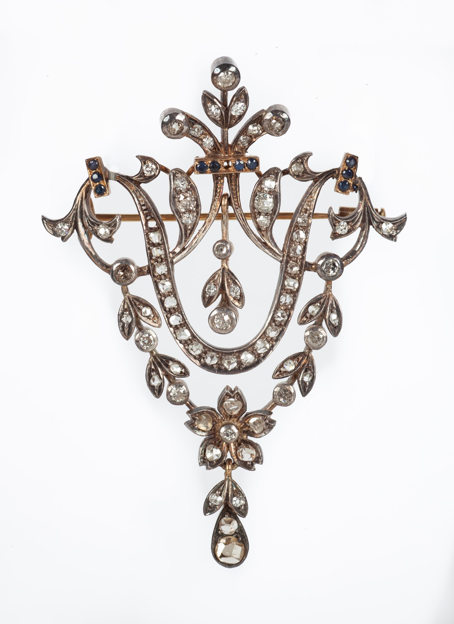 Spilla antica in oro e argento cm 7,5 x 5,5 Oro a basso titolo e argento. Diamanti in taglio antico e taglio rosa e zaffiri. Peso complessivo gr. 18,90.