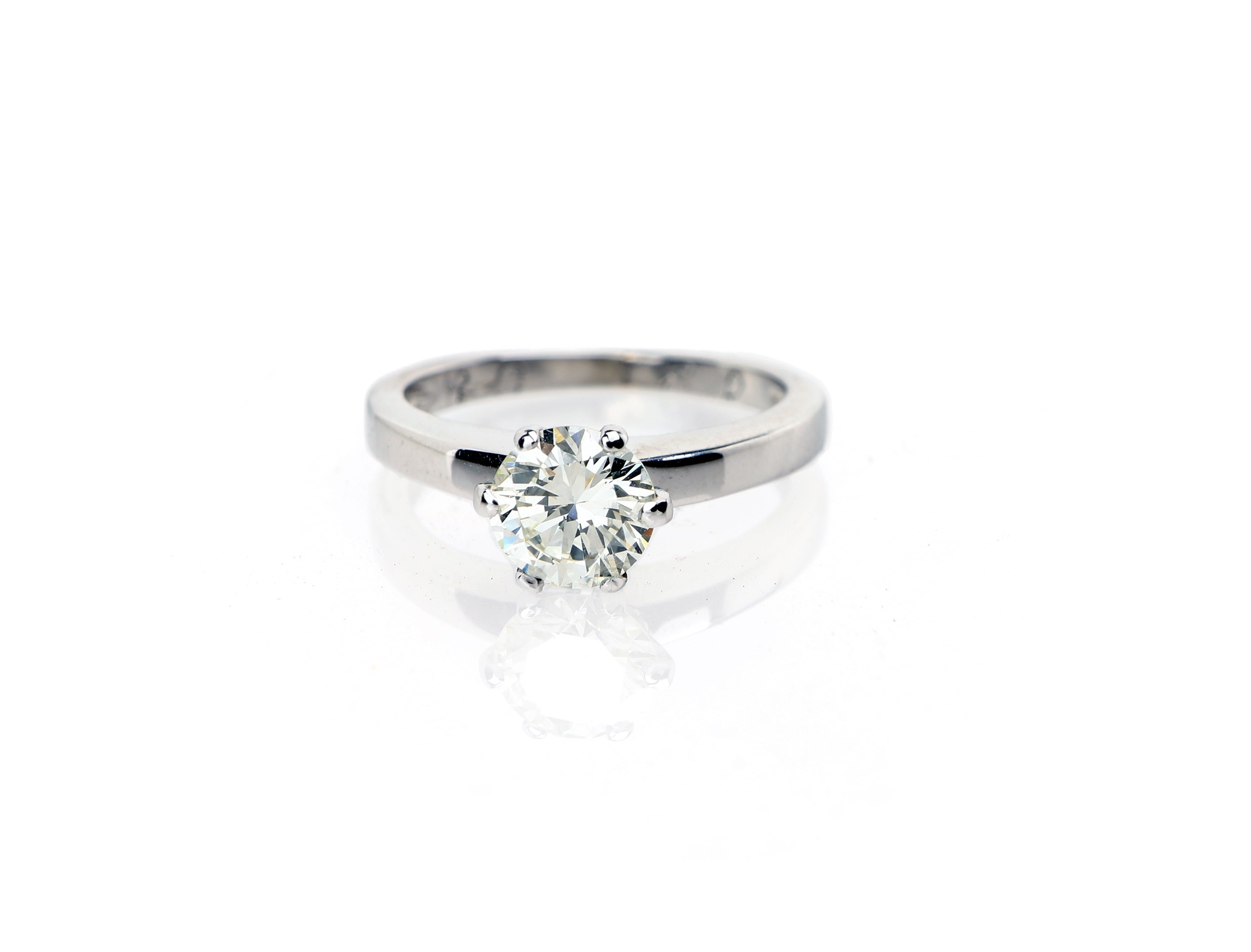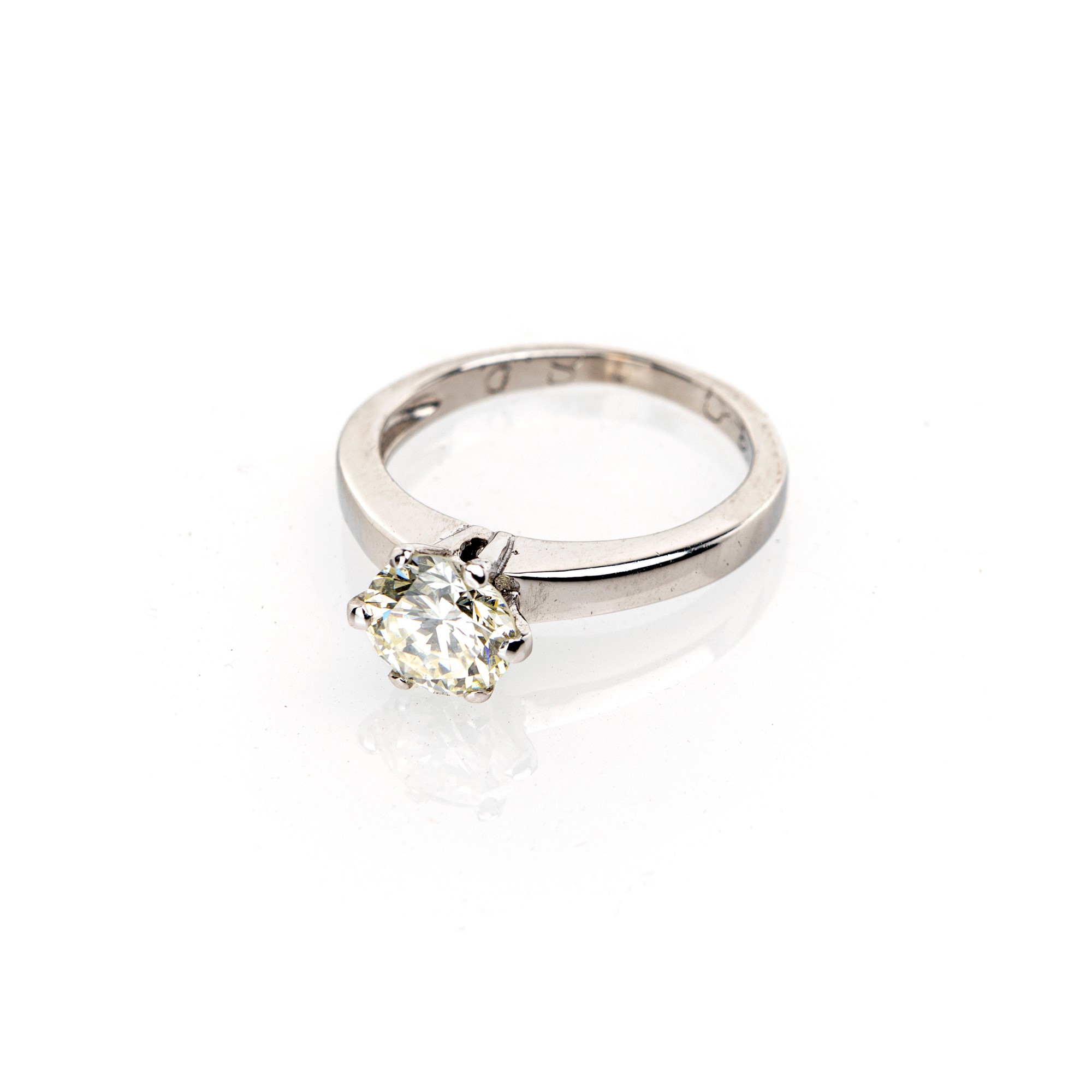 Anello in oro e brillante mis. 12 Oro bianco 750/000, Diamante centrale in taglio rotondo brillante ct. 0.98 ca prob. J-VS. Peso complessivo gr 3.80