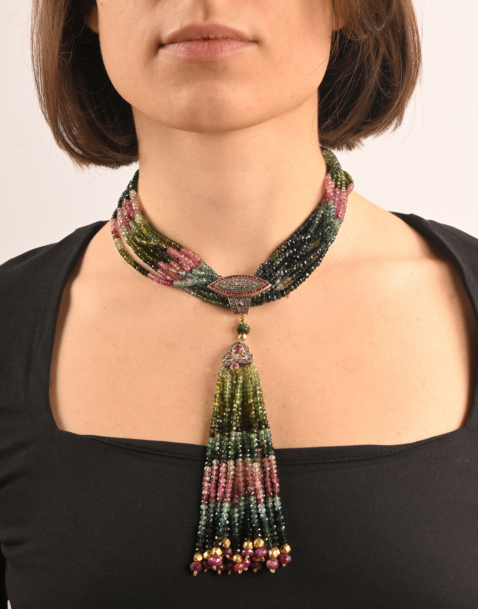 Collana in tormaline multicolor, oro, argento, diamanti e rubini