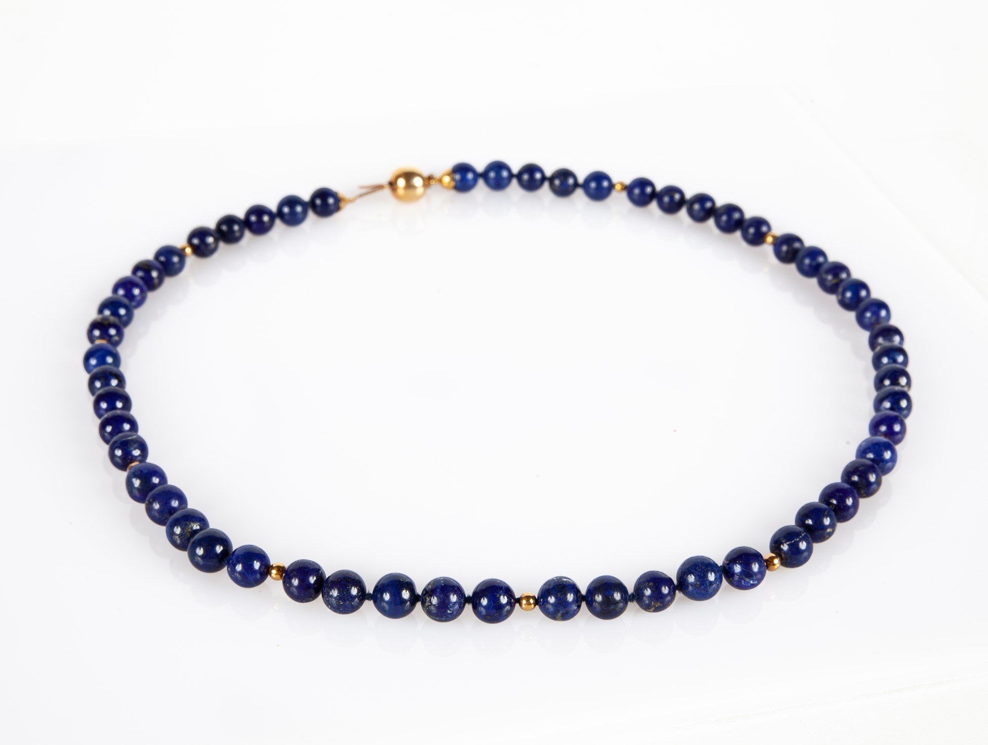 Collana in lapislazzuli e chiusura in oro. Lunghezza cm 65 Oro giallo 750/000. Lapislazzuli diametro mm. 10