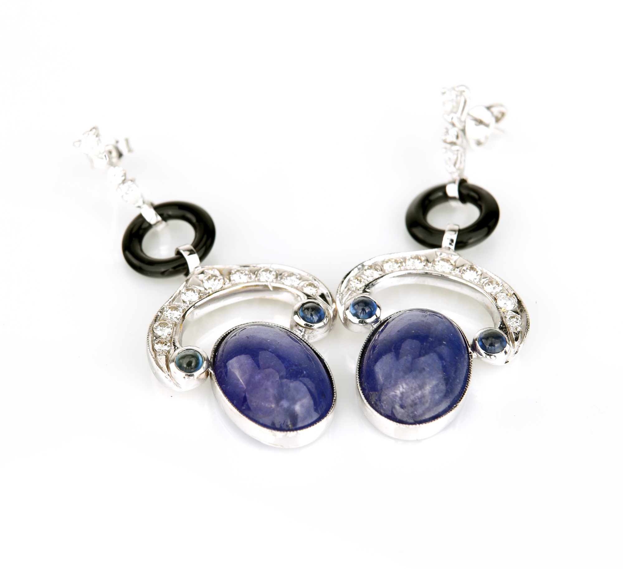 Orecchini in oro brillanti, onice e tanzanite Lunghezza cm 5 Oro bianco 750/000. Diamanti in taglio rotondo brillante ct. 1,50 ca, tanzanite in taglio cabochon ct. 12 ca.